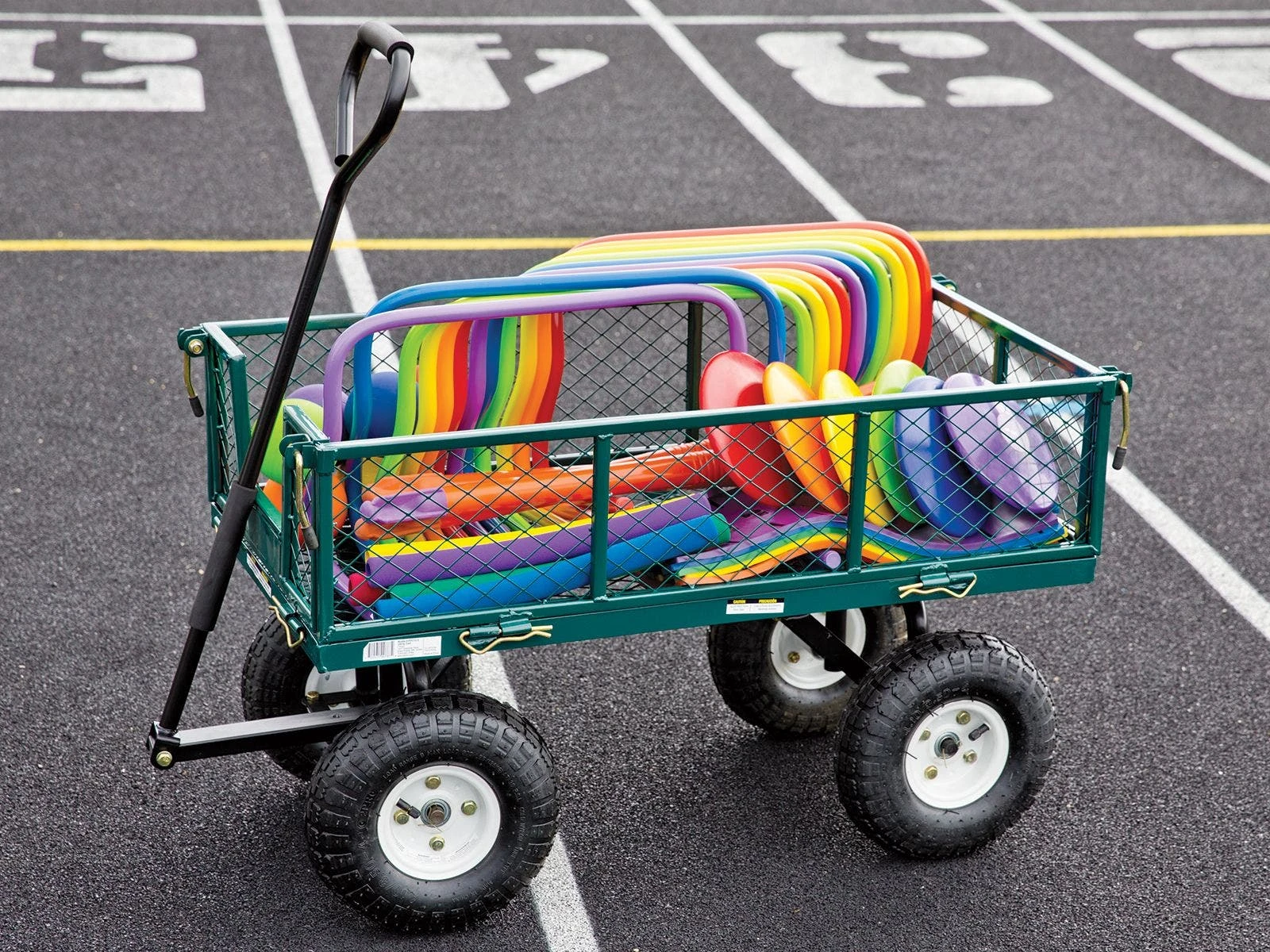This entire track and field pack is designed for beginners, making it perfect for use in an elementary setting, indoors or out. Everything in the pack stores easily inside an included heavy-duty wagon with rugged wheels for easy transportation. Wagon color may vary.