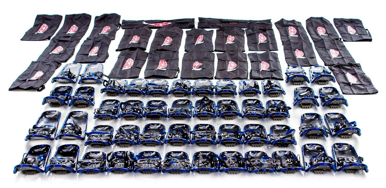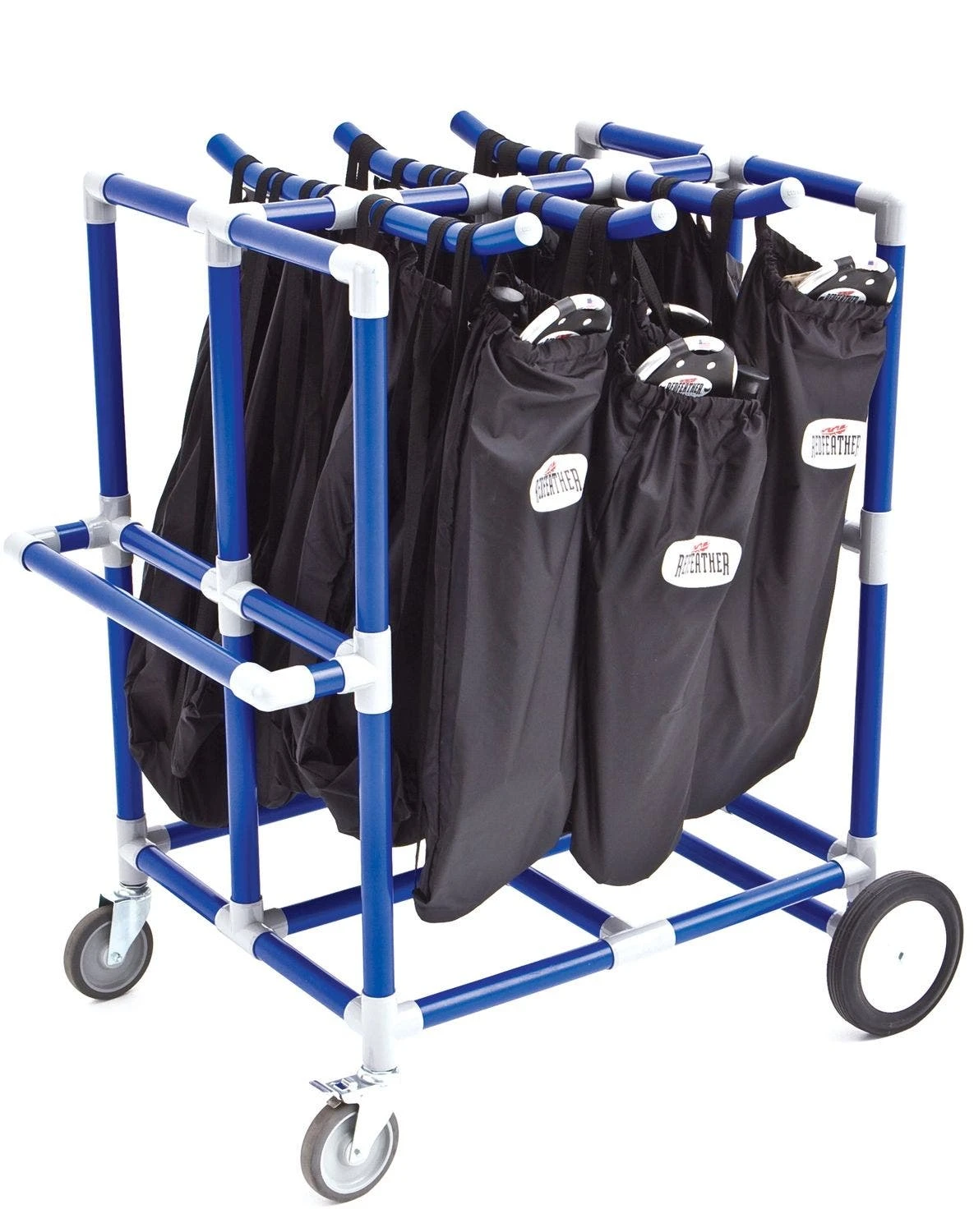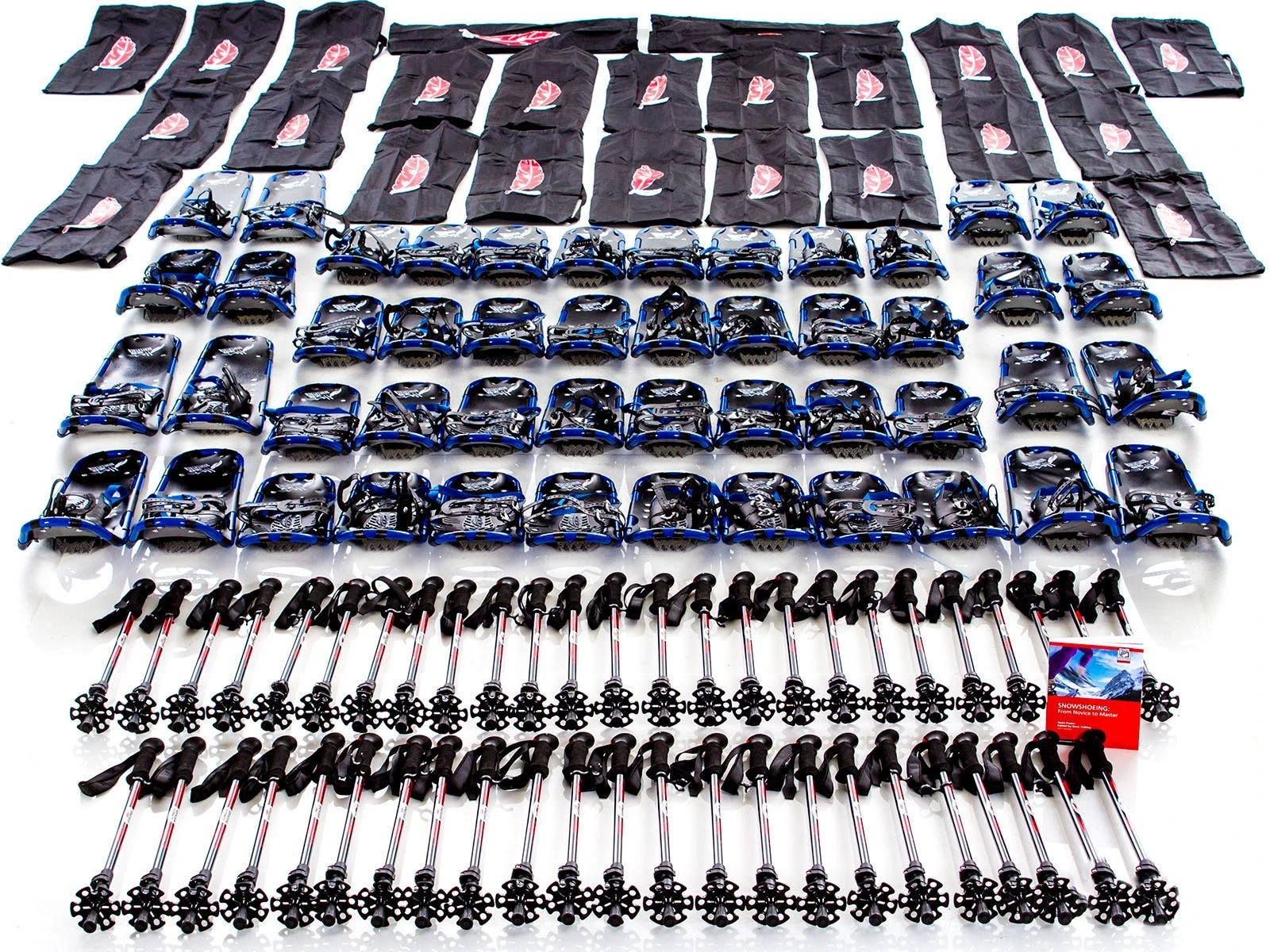 These ready-to-use packs include enough institutional-quality snowshoeing equipment for up to 24 students. An included Magnus snowshoe cart and carrying bags help transport it all. All-terrain 10” dia cart wheels feature 6” dia ball-bearing swivel casters and pedal locks for easy mobility across all surfaces. Pairs of snowshoes come in individual bags, which hang on the cart. Students can simply grab them and get set up. Snowshoe colors and graphics may vary. Cart is 36”L x 30”W x 40”H, 22 lb.