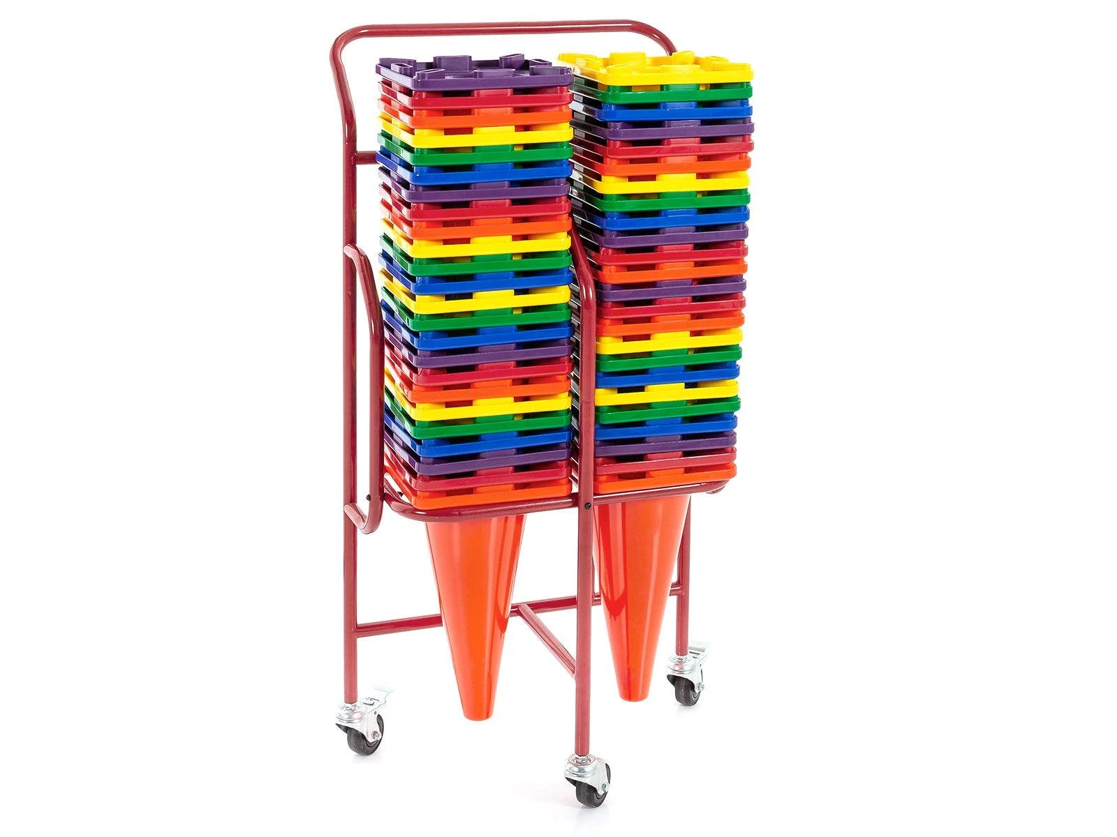 Keep up to 48 cones steady while rolling them from the storage room to the playing field. Two stacks of cones allow for maximum storage and 3-wheel design prevents the need to tip and balance heavier 18” vinyl cones.