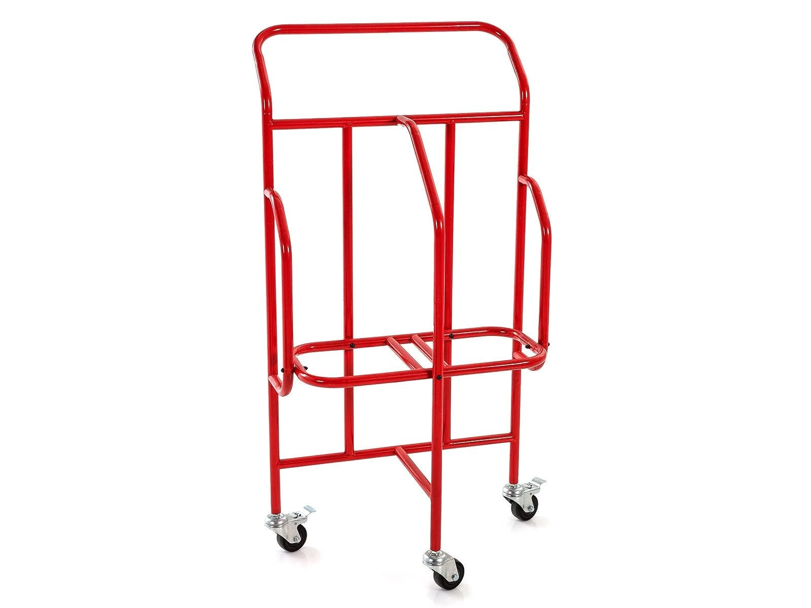 Built to last, this cart features 1” dia powder-coated steel, which looks professional and protects against rust. Two 8” rubber wheels also make the cart run smoothly on your gym floors. 19-1/4″L x 26″W x 51″H; 27 lb.