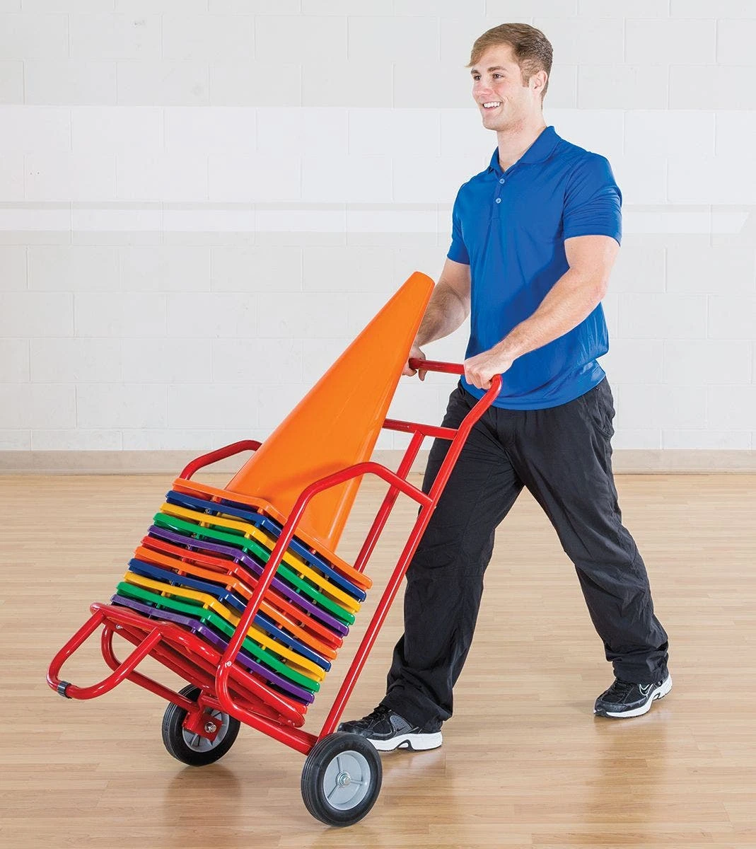 Trust this cart to keep cones steady while rolling them from the storage room to the playing field. The design of this cart allows you to tip it back for load stability, preventing the cones from tipping off the cart when transporting them.