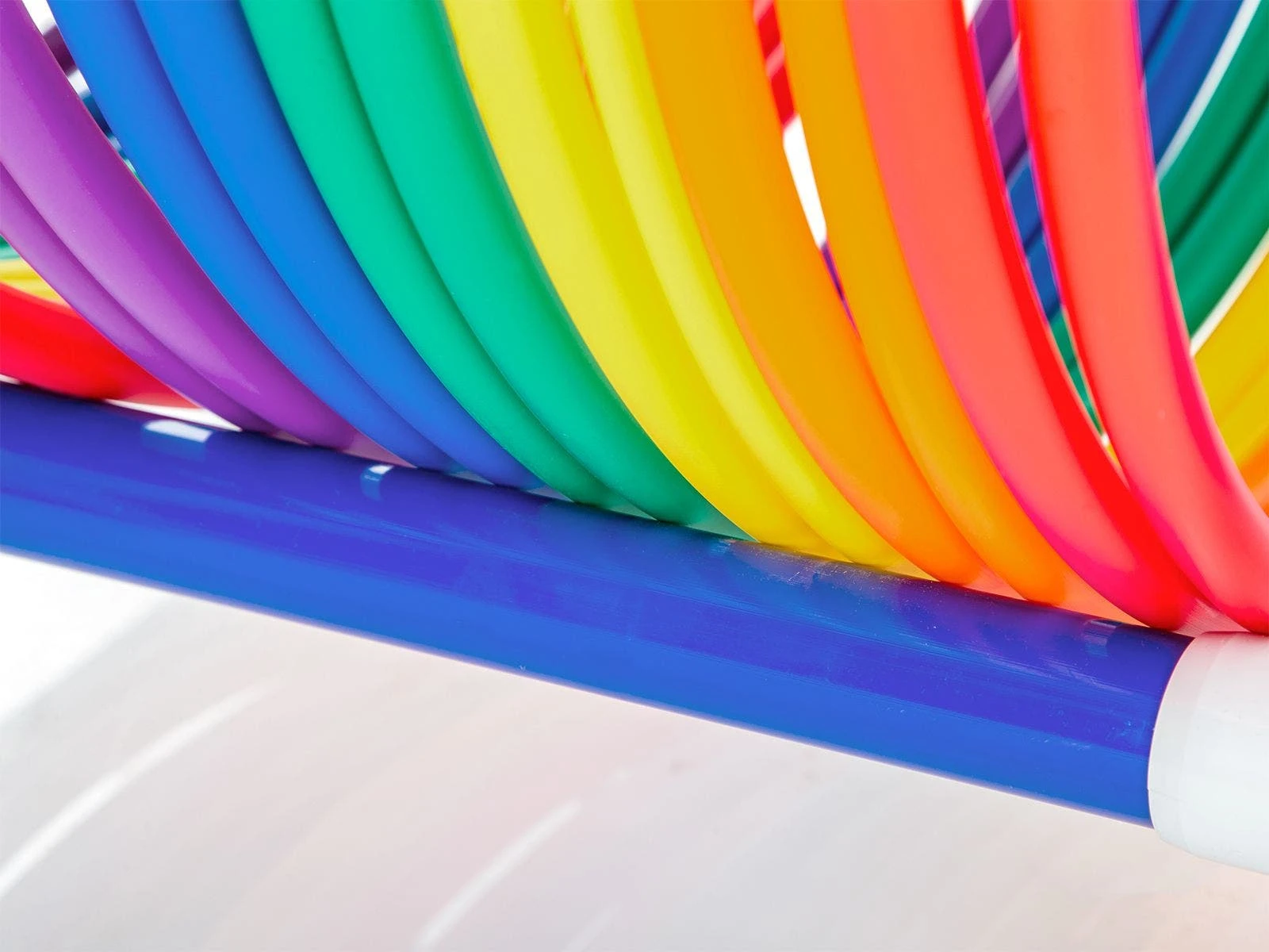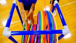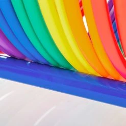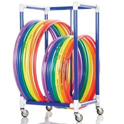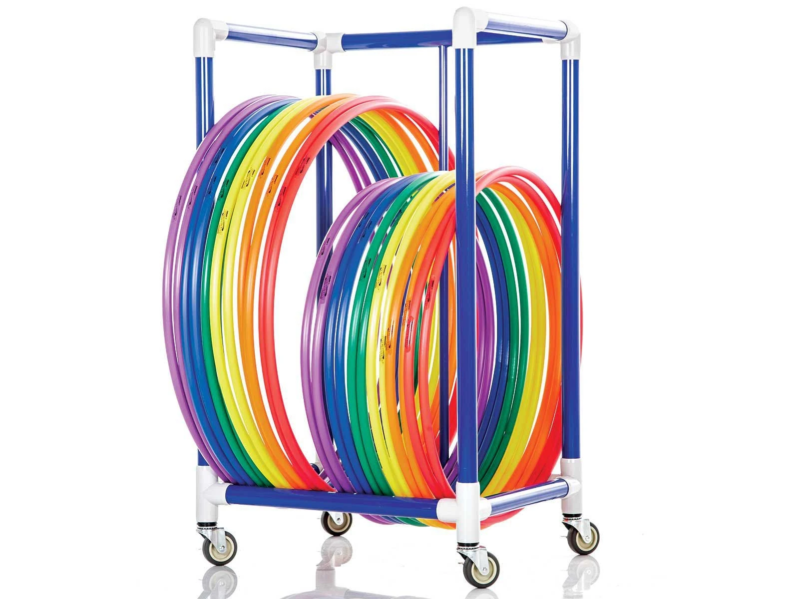 Organize hoops in a cart that holds them all! Simply set hoops in it, instead of hanging them on pegs, for easy access. Cart conveniently stores up to 24 hoops ranging from 24” to 36” dia. Easily move cart through doorways on four 3” dia locking casters. Cart is 21-1/2”L x 27”W x 46”H; 4 lb. Hoops are not included.