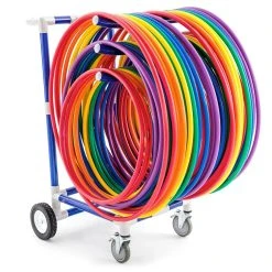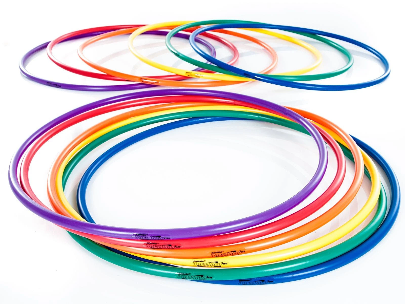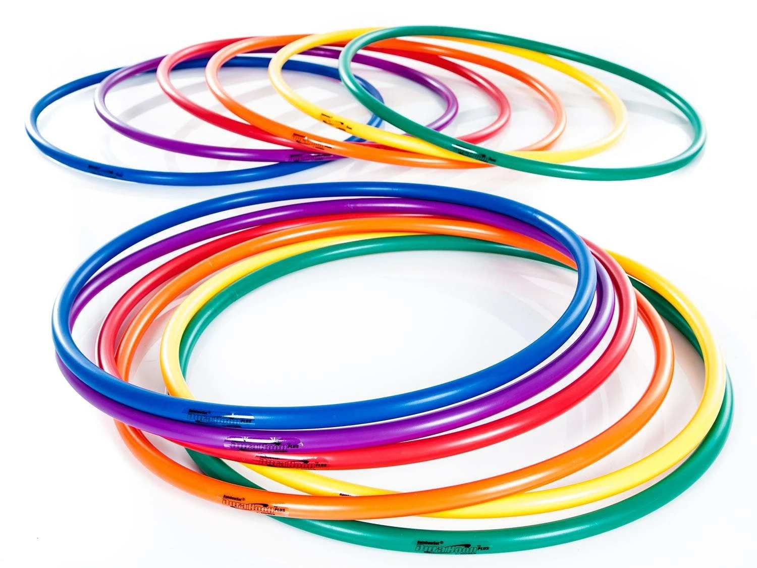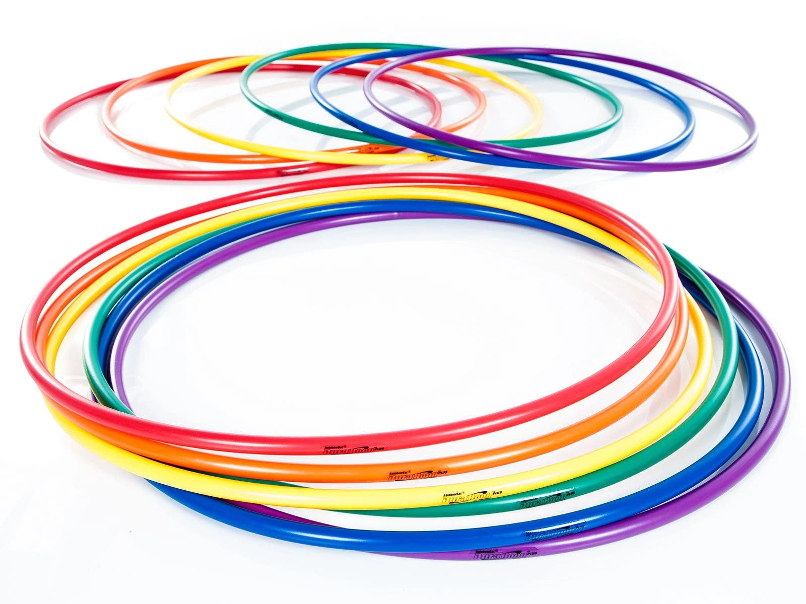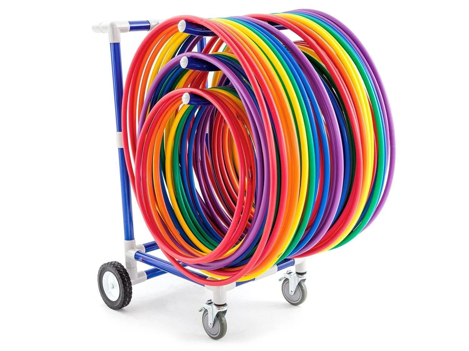 Class Pack includes 72 hoops (24 ea 24″, 30″, and 36″ dia) and a hoop caddy. Rainbow Sets of 12 are also available in 3 hoop sizes.