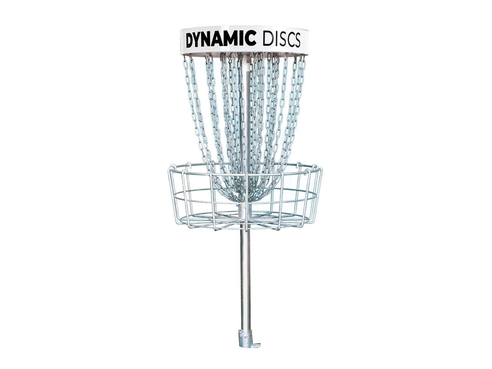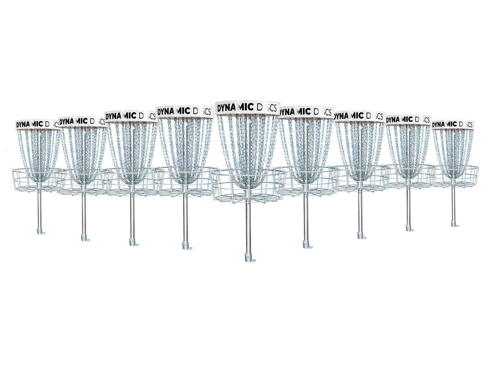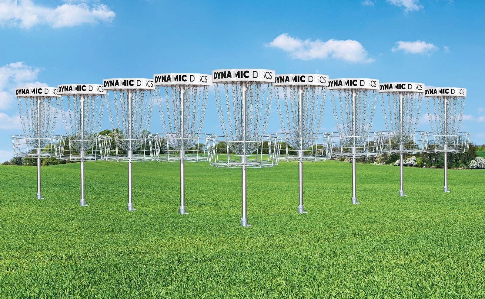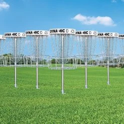 Play disc golf at a championship level with superior targets. Each includes 26 hot-dip galvanized chains—13 inner and 13 exterior—to consistently grab discs play after play, year after year. Gloss white steel top assembly and basket cage feature an e-coat finish that’s then followed by a powder-coated finish for enhanced durability outdoors. A vibrant 2″H top deflector band makes it easy for players to spot the target in any conditions. Each target includes tension screws for increased stability, a ground sleeve, locking collar, and a padlock. Assembly and in-ground installation required. Available individually or in a Set of 9 to set up a course. Each target is 27″ dia x 52″H; 57 lb.