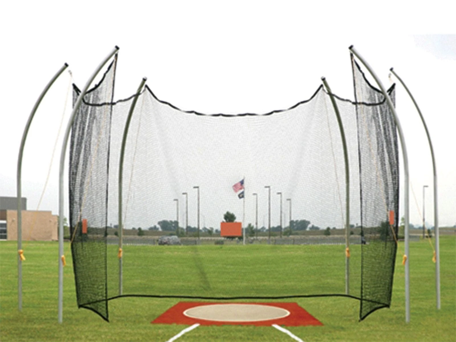 High-quality, aluminum poles with a 34″ rolled offset provide a lighter yet durable discus space. Ground tubes are made of heavy-duty, solid core poly vinyl so poles easily slide into place and are stable. The ground sleeves have covers to keep dirt and water from getting inside the poles and anchor holes. The 58’L x 14’W all-weather net is attached with carabiners and spring clips, allowing quick setup and take down. Meets NFHS specifications.