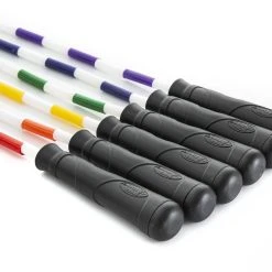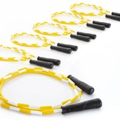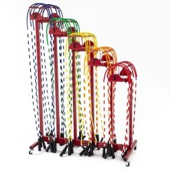 Ropes are available in Sets of 6 in 6 lengths or in a convenient Rope Pack with 30 ropes (6 ea 6′-10’L) and a MeasureUp Jump Rope Rack (42-1/2″L x 20″W x 64″H; 50 lb). The powder-coated steel rack features a tiered design based on rope length for easy organization and allows students to quickly select the correct rope. It moves smoothly on four locking casters. Assembly required on rack.