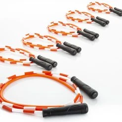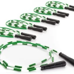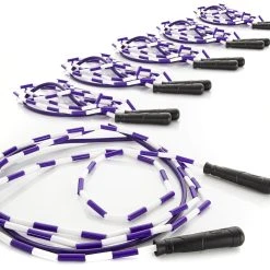 Unique design of NeverWear ropes protects both the rope and gym floors. We replaced the plastic segments in the center of the ropes with a PVC section that absorbs impact, resists wear, and won’t leave marks where it makes contact with the ground. The heavier weight of the PVC and 1-1/2″L x 7/16″ dia plastic segments also allows the rope to turn at a slower speed for beginners. As the rope hits the ground, it provides jumpers with rhythmic audible feedback.