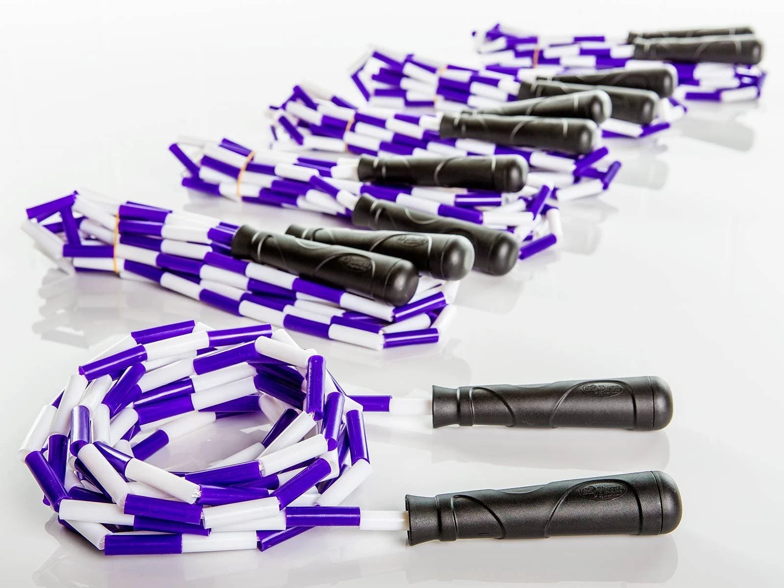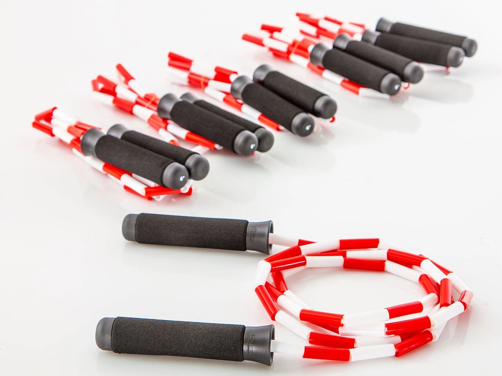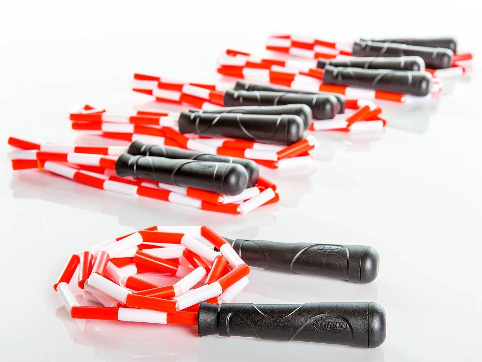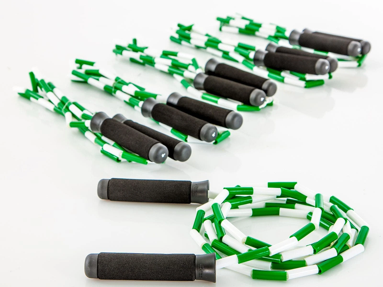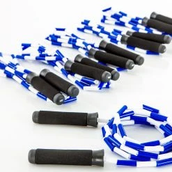 Plastic ball bearings molded into the 5-1/2″L handles, combined with the extra weight of the segmented rope itself, propel momentum as a student jumps. This emphasis on design creates slower, smoother revolutions with less effort as friction is reduced. This helps beginners master the timing of their jumps, without tiring from spinning the rope.