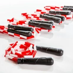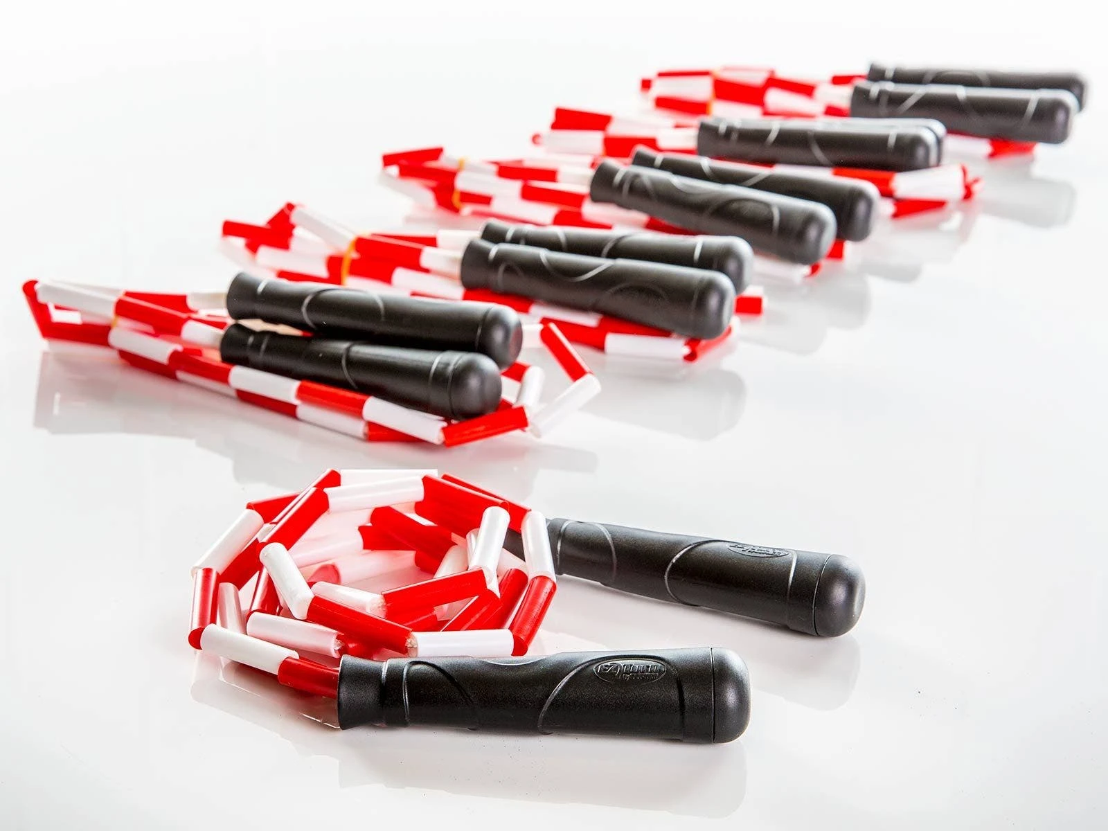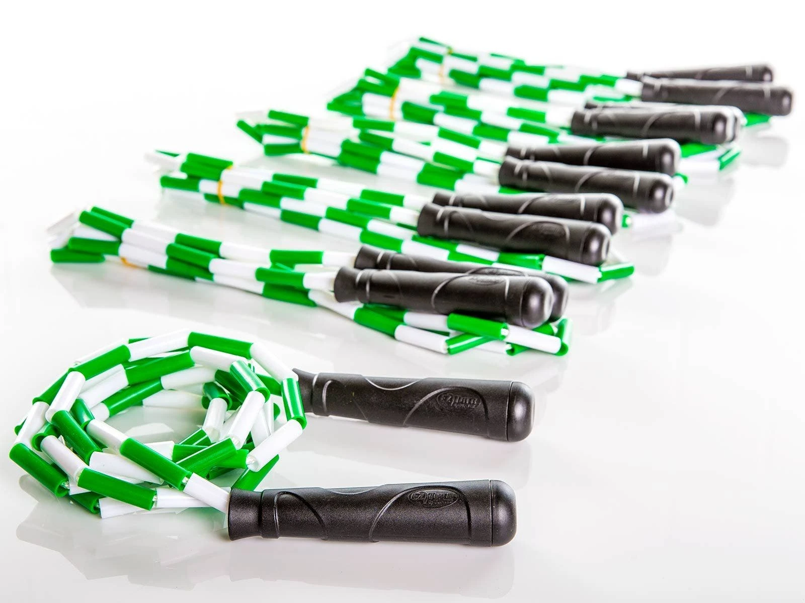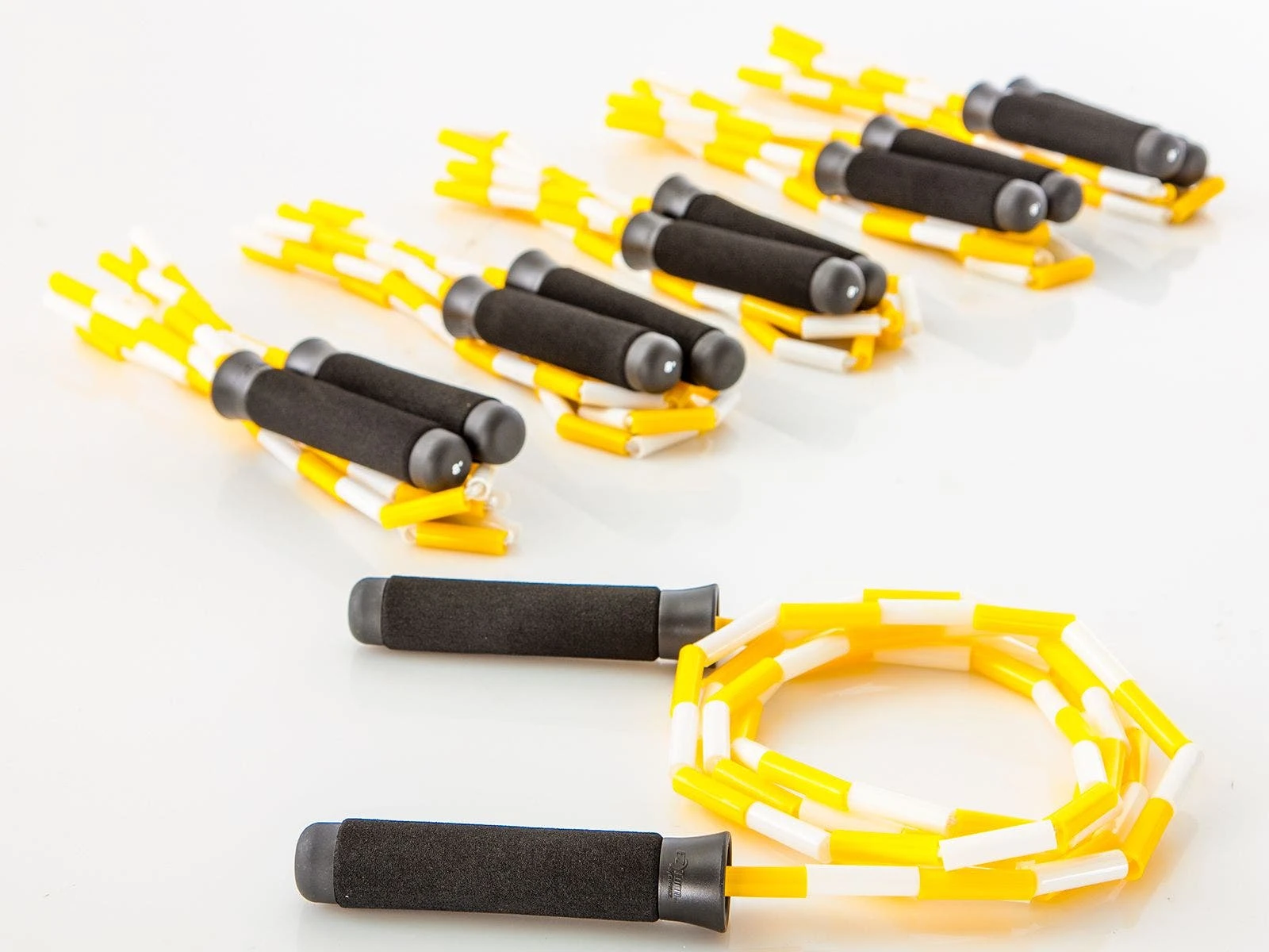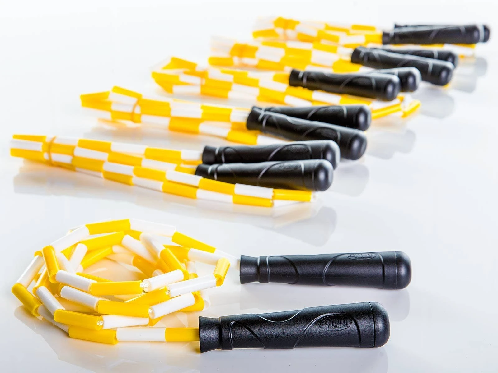Plastic ball bearings molded into the 5-1/2″L handles, combined with the extra weight of the segmented rope itself, propel momentum as a student jumps. This emphasis on design creates slower, smoother revolutions with less effort as friction is reduced. This helps beginners master the timing of their jumps, without tiring from spinning the rope.