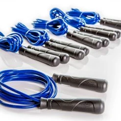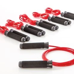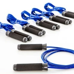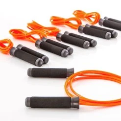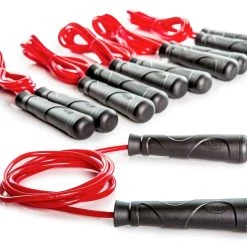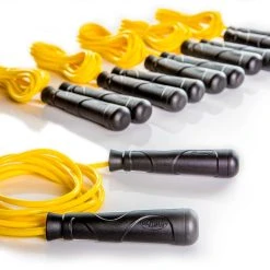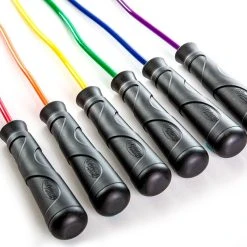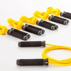 Sturdy, one-piece, grooved plastic handles (5-1/2″L) offer an ergonomic, no-slip grip for comfort and safety. Foam handles add extra comfort. Smooth rotation from molded-plastic ball bearings inside the handles promote faster turning for a high-intensity cardiovascular workout. With a thin 1/4” diameter, these ropes are light enough to teach fundamentals to younger students.