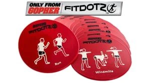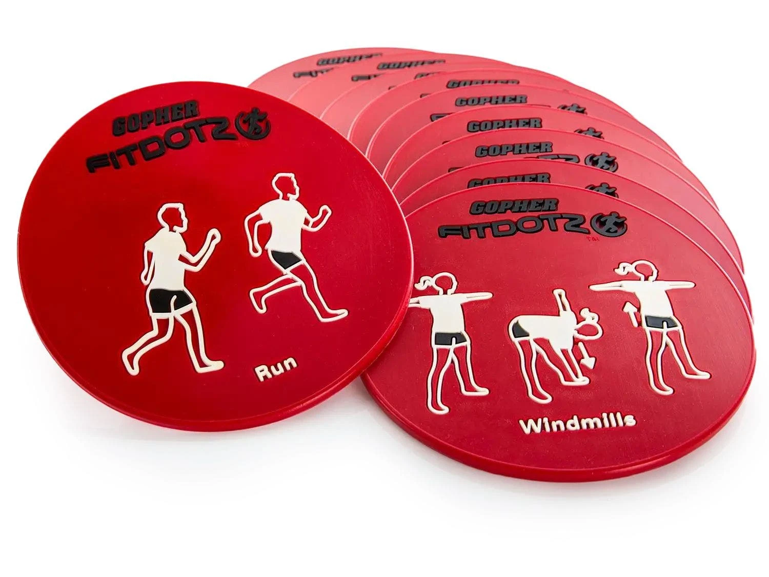 Each poly spot features start and stop examples of exercises to guide students through exercise circuits and warmups. Resilient, weatherproof, and flexible, these molded-vinyl fitness markers can be used indoors or out on almost any surface. Each 9″ dia spot depicts an individual exercise.