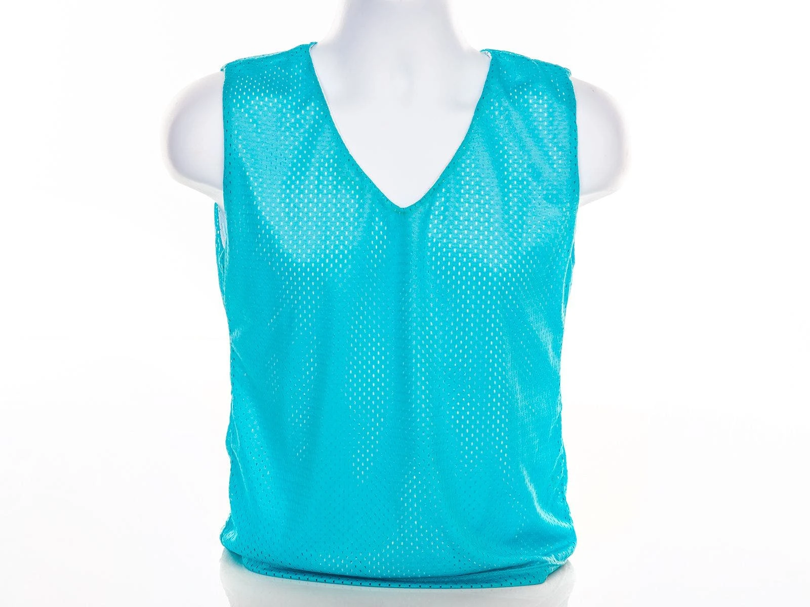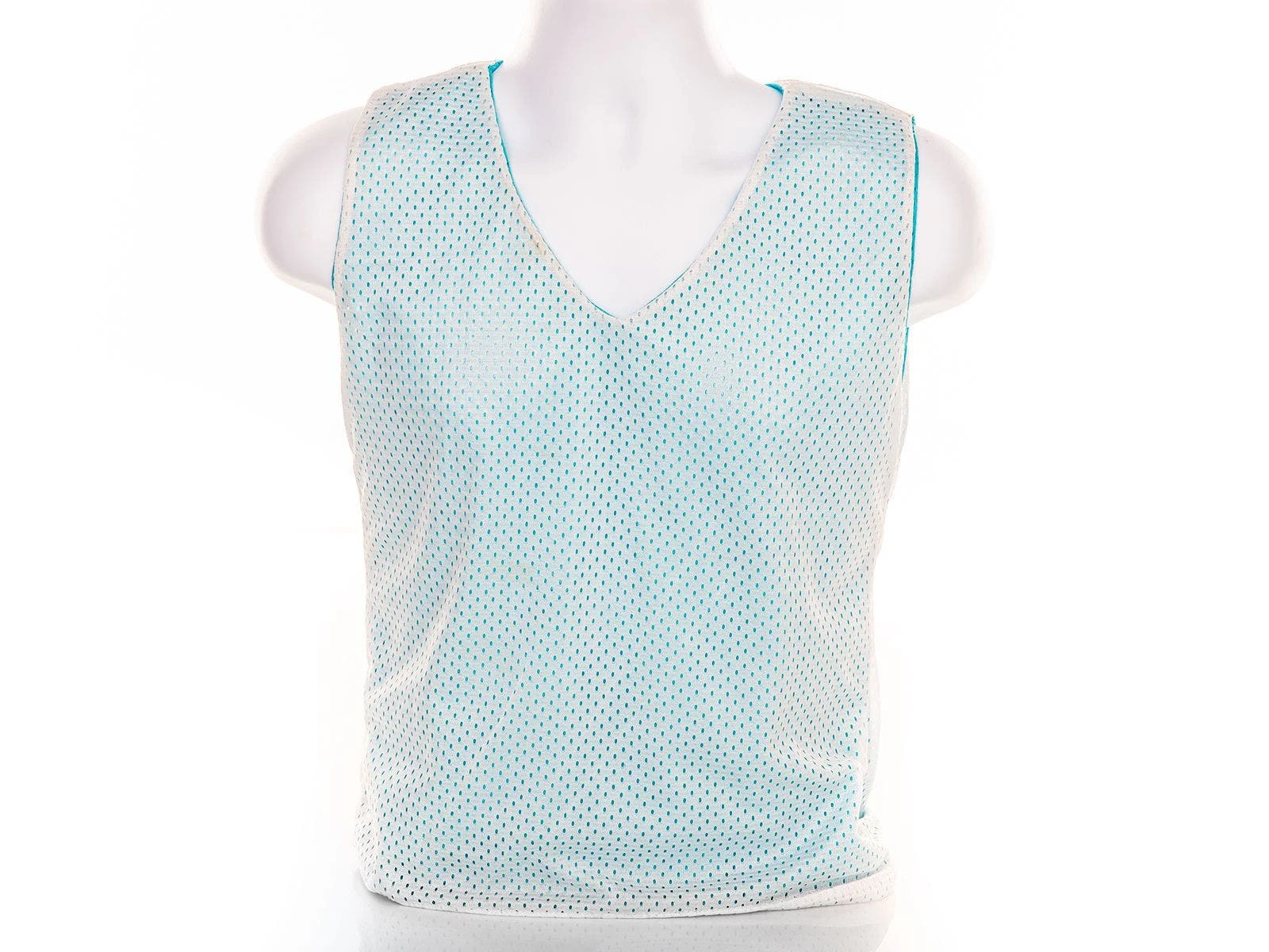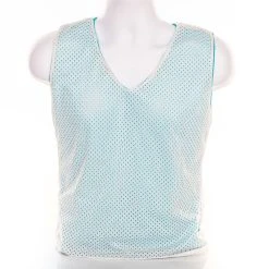 These mesh reversible jerseys feature a V-neck, contoured design for a better fit. With a no elastic bottom that sits away from the body, these jerseys provide users more room for easy on/off. Sleek, fitted design is reversible for female players to organize and change teams, and get to scrimmaging in no time! Jerseys are light blue on one side, white on the other to identify teammates with ease. Breathable woven polyester mesh construction wicks away sweat to keep users comfortable. Available in Medium (23″L x 19″W) or Large (26″L x 23″W) sizes.
