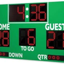 Clearly see the time, score, and how many yards offense has to go for a first down on this scoreboard. The 15″H LED numbers are highly visible to players and spectators up to 300′ away. A 100,000 hour rating ensures years of use with minimal maintenance. The board also displays downs and quarters.