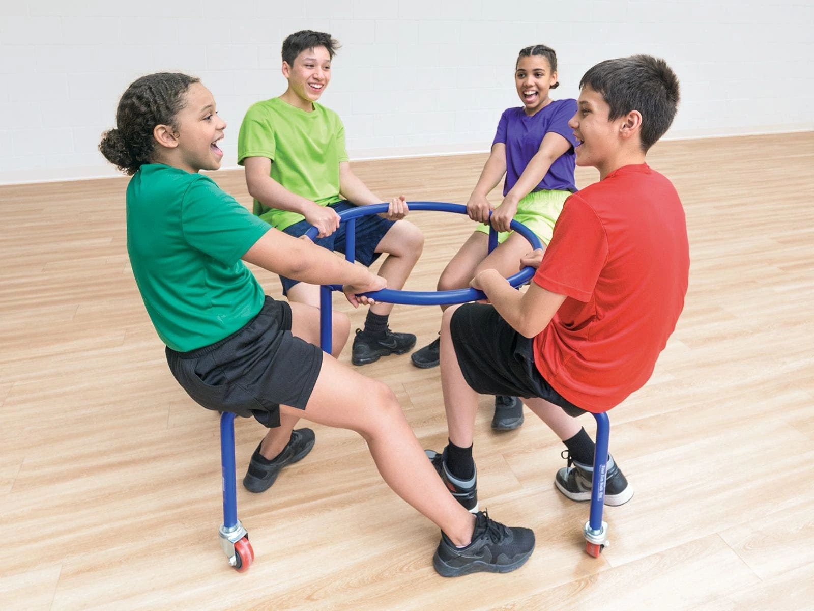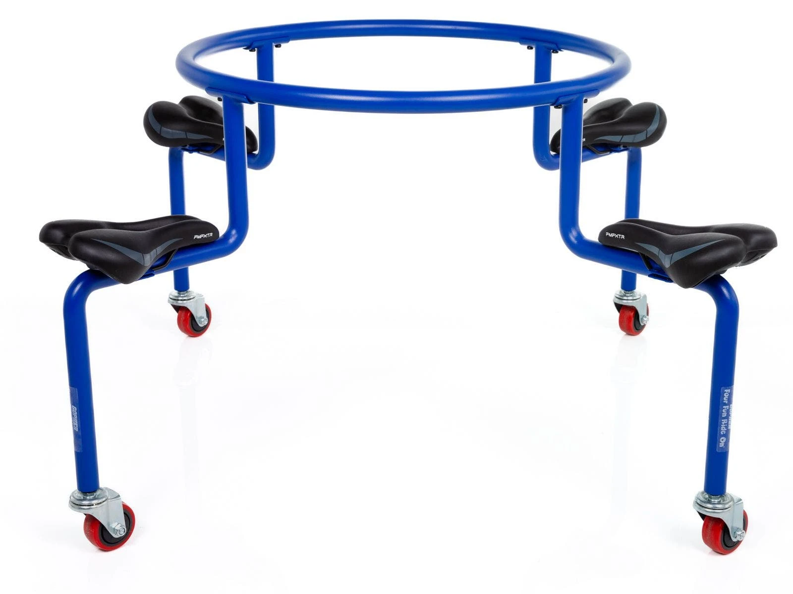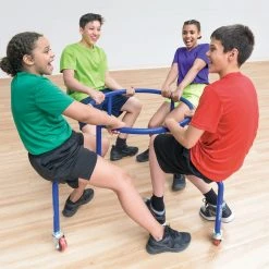 With 4 seats connected to a circle, students need to communicate and work together to move the ride on. They hold the 27-3/4″ dia circular center handle while scooting on the four-seat bike. Each bicycle-style seat is 19″H and sits atop a 3″ dia non-marring caster for smooth movement over indoor and outdoor surfaces. Frame is made of powder-coated blue, 18-gauge steel for maximum strength and durability. Supports up to 600 lb total (150 lb per seat). Assembly required. 26-3/4″H x 53″ dia; 26 lb.
