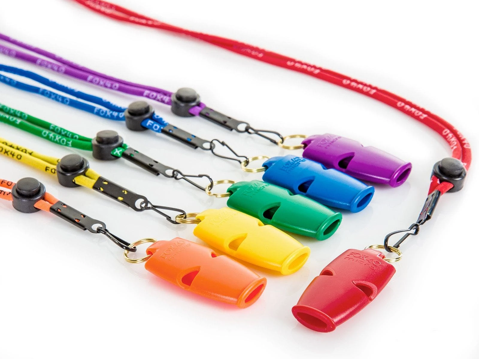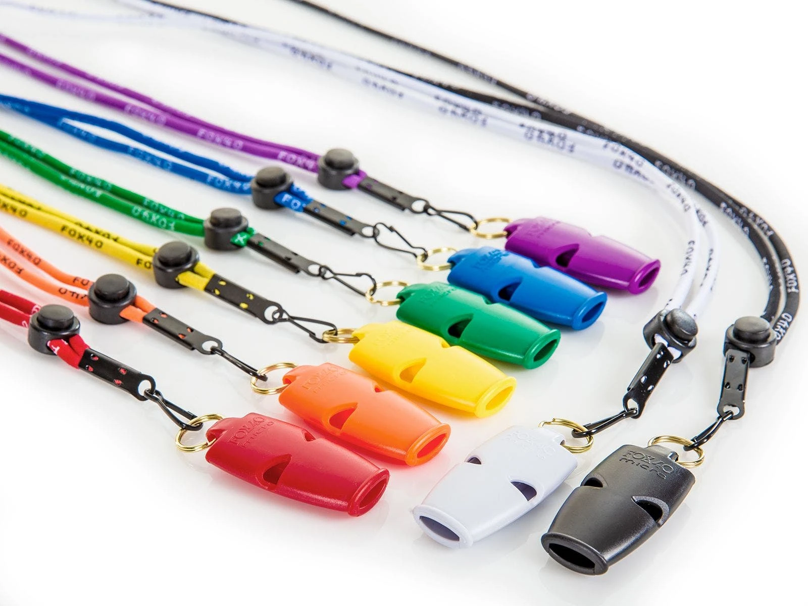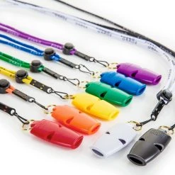 Choose whistles in a Rainbow Set of 6 or in a Rainbow Plus Set of 8 (1 Ea Rainbow color; plus 1 Ea black, white). Whistles also available individually in black. Each whistle set comes with breakaway lanyards.