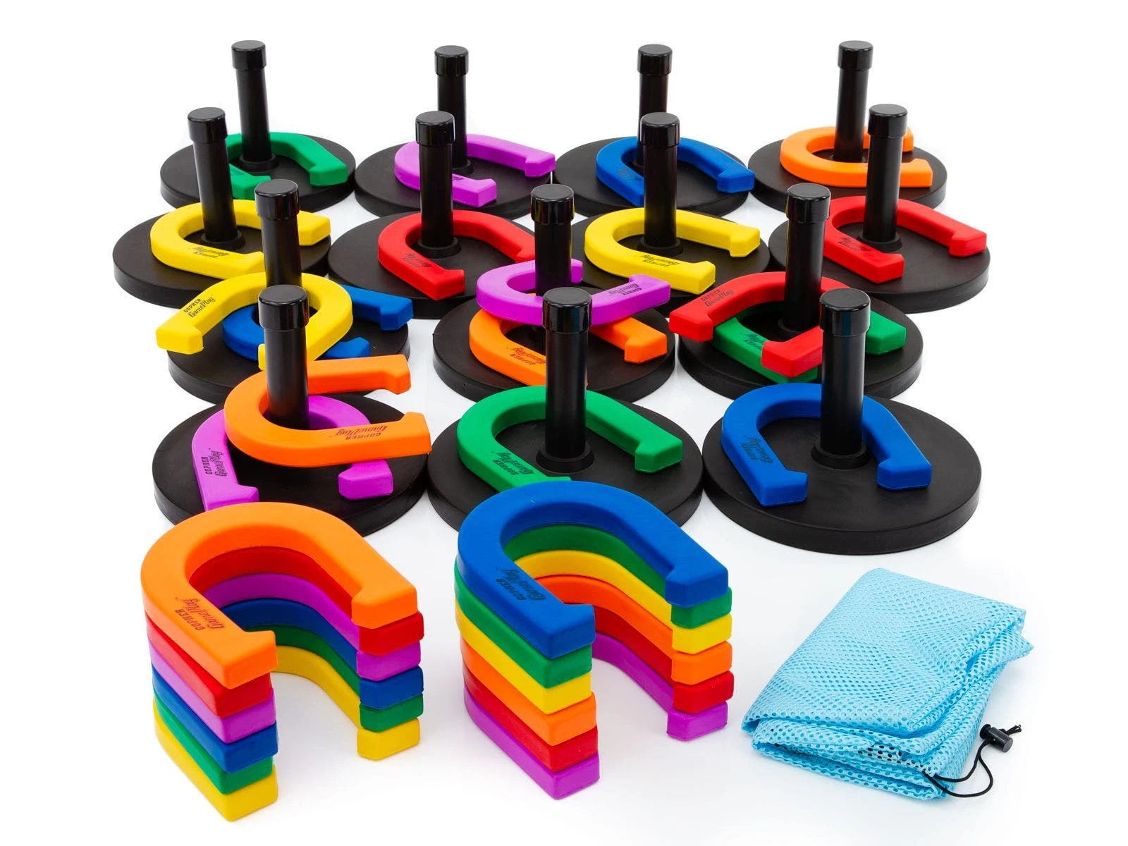 Set includes 30 foam horseshoes, 14 foam stakes w/ base, storage bag, and activity instructions.