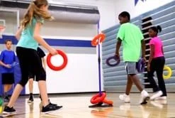 At the signal, players throw their team’s colored rings, trying to land them on the 6 teetering poles in the center of the play area. Teams strategize where to throw, because the longer the run of consecutive rings on a pole, the more points a team earns (2 rings = 1 point, 3 rings = 2 points). Other teams can block points by landing a ring on a pole and interrupting the color run. The more rings hit poles, the more the poles teeter, creating a bigger challenge to score.