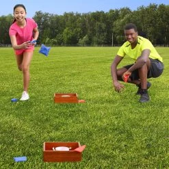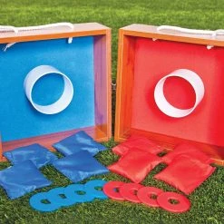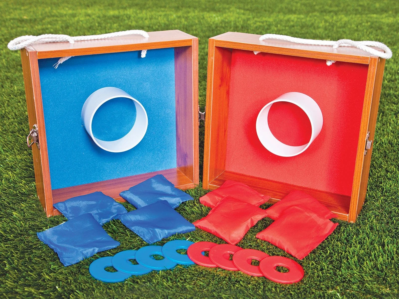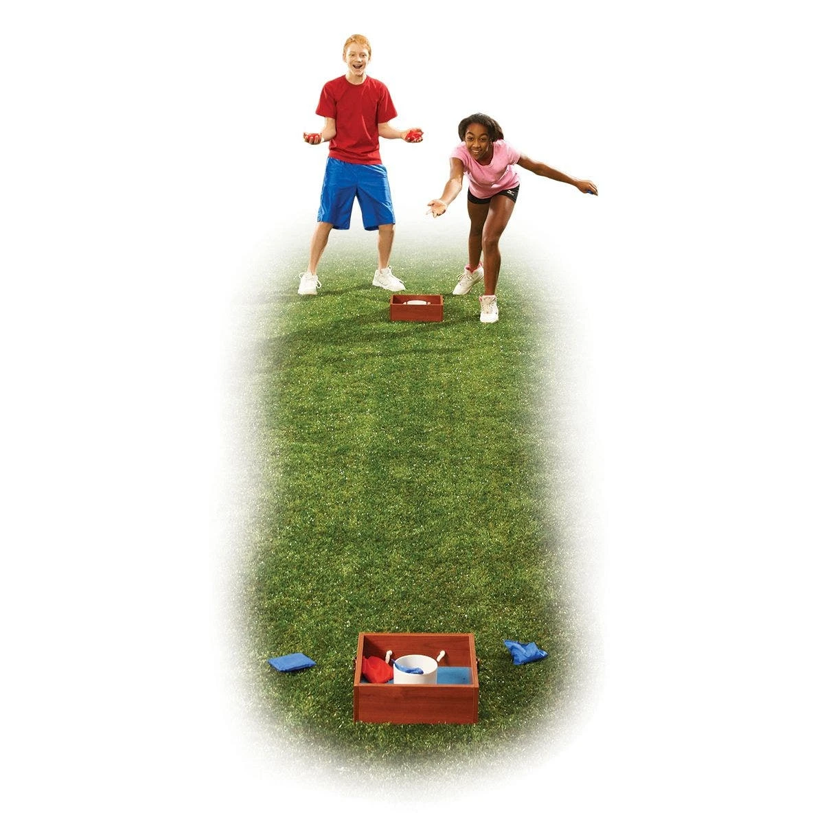 Players toss plastic-coated metal washers toward the target area and earn points when they land in the box or cup. Use the included beanbags for a softer alternative or for indoor play.