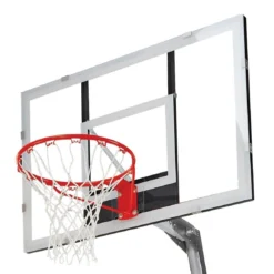 System includes a 48″W x 32″H backboard made of 3/8″ thick acrylic. It plays similarly to glass, but is lighter weight for easier portability. Fixed-rim goal mounts directly to the backboard.