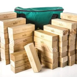 Sets include 58 pine wood blocks and a storage bag. Standard blocks (8″L x 3″W x 2″H; 11 oz) create a tower 3’H. Junior blocks (6″ x 2″W x 1-1/4″H; 4 oz) create a tower 2’H.