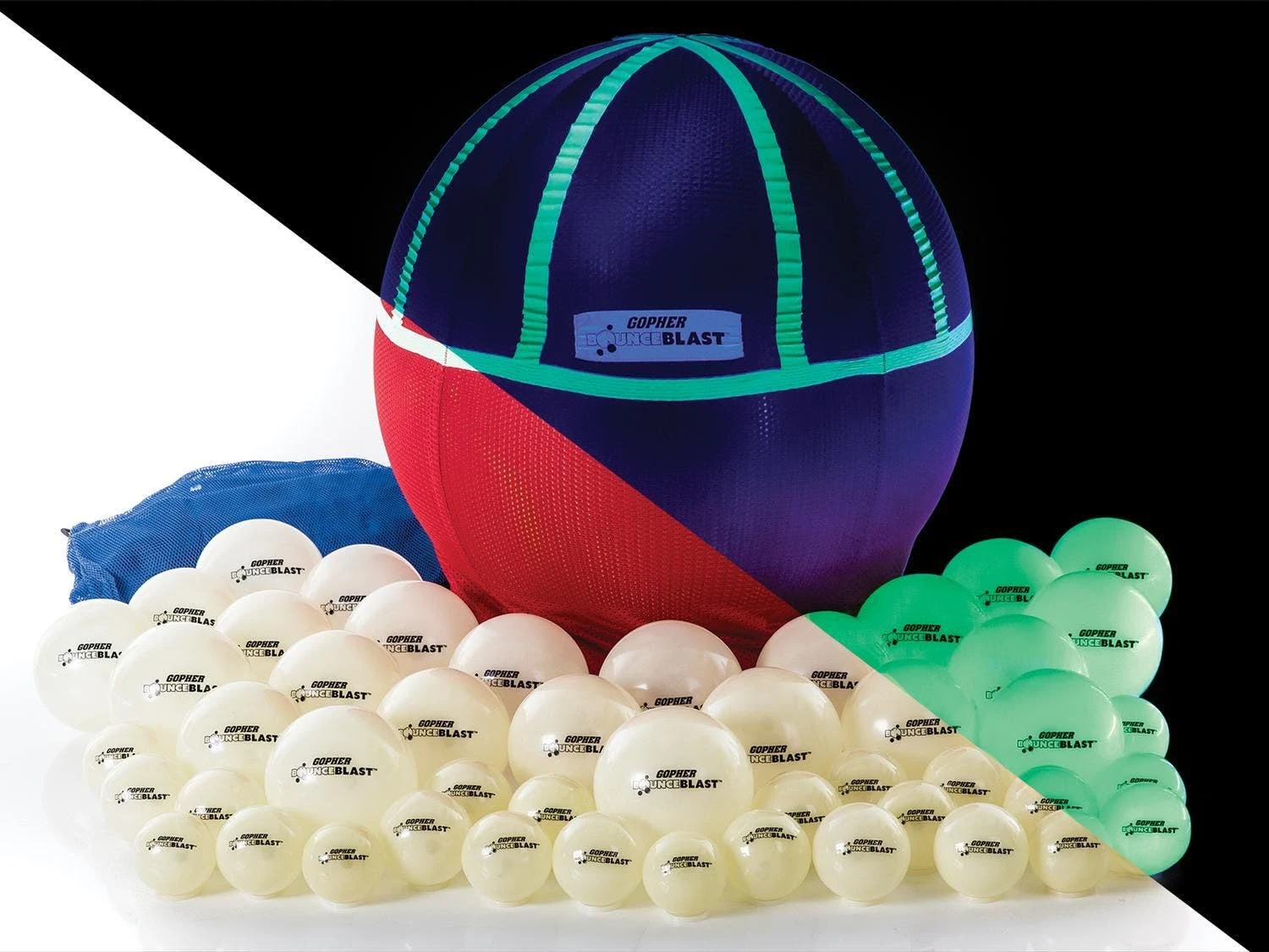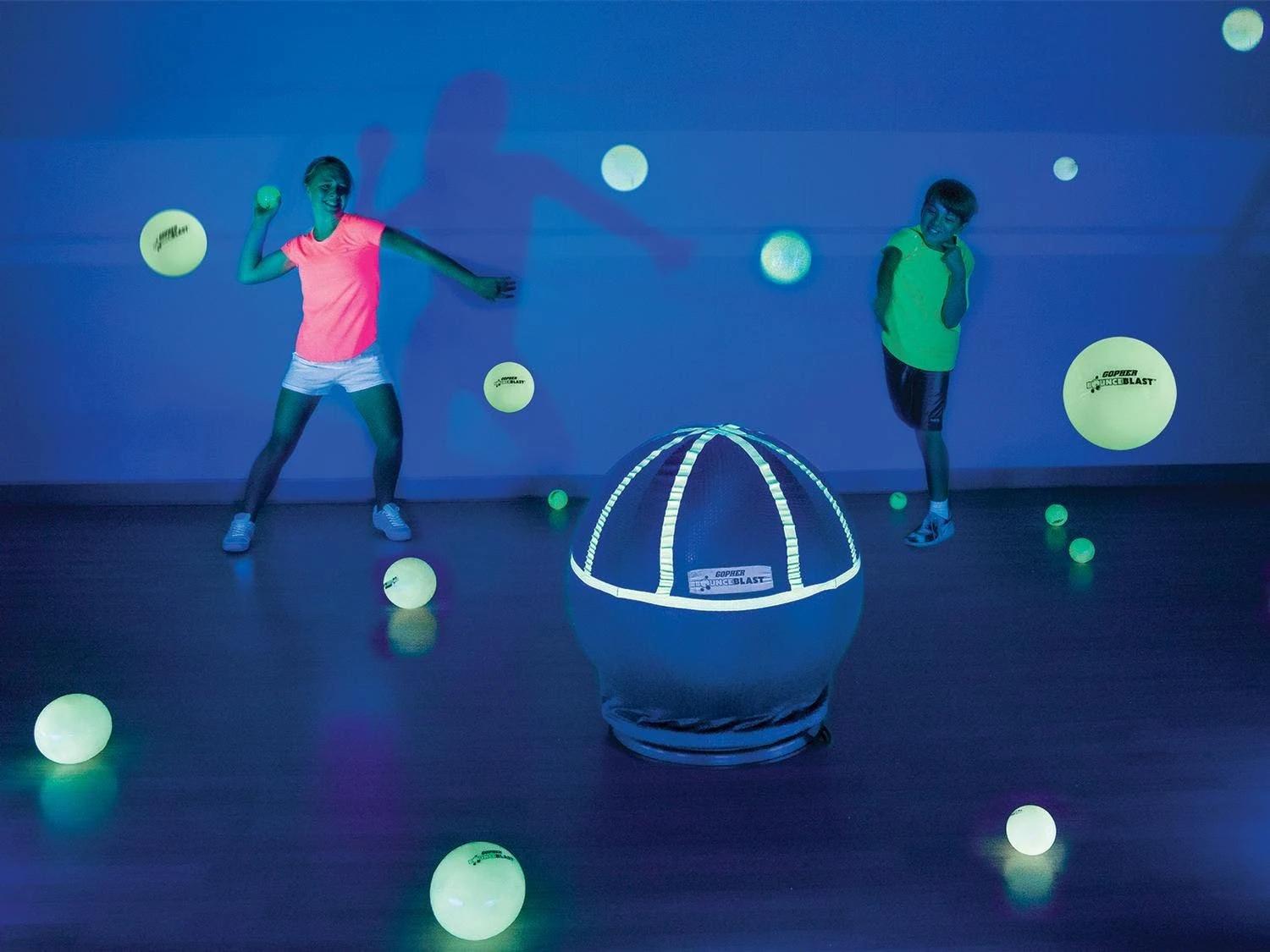 Stripes along the rebounder glow in the center of the dark play area. Players bounce balls off of it, causing them to ricochet in any direction. As one team throws the glow-in-the-dark balls, players on the other team work together to track and catch them as the balls soar through the air. Charge the rebounder and the balls under any light source, and have a blast for at least 60 minutes.