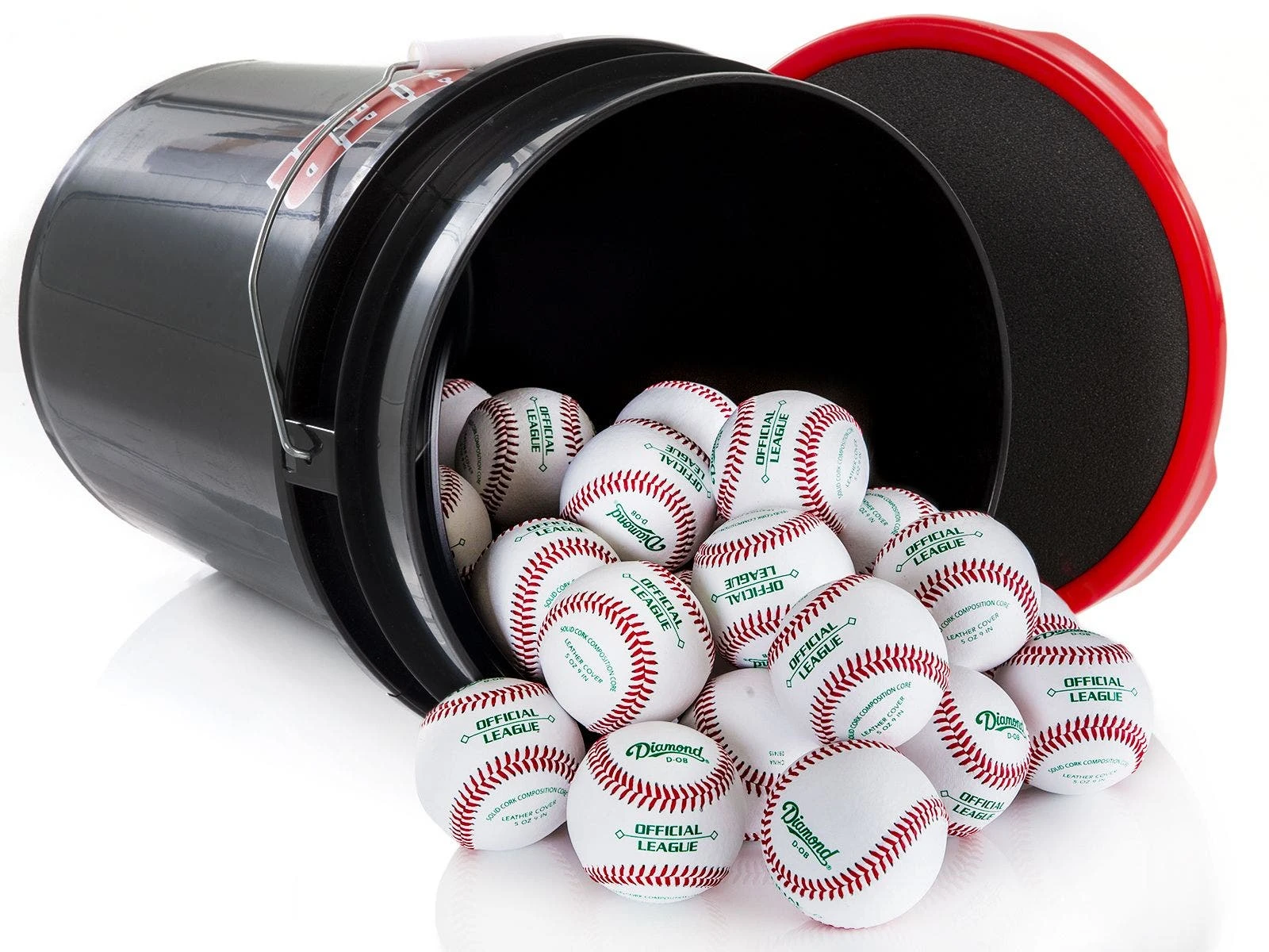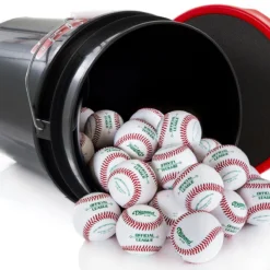 Thick, heavy-duty plastic bucket holds up to 3 dozen baseballs, 2 dozen softballs, or 3 dozen pickleball balls. A foam paddle cover holds balls inside the bucket, while also serving as a cushioned seat during practice or games. Grab the plastic grip on the metal handle for easy hauling. Bucket is 17″H x 12″ dia. Balls not included.