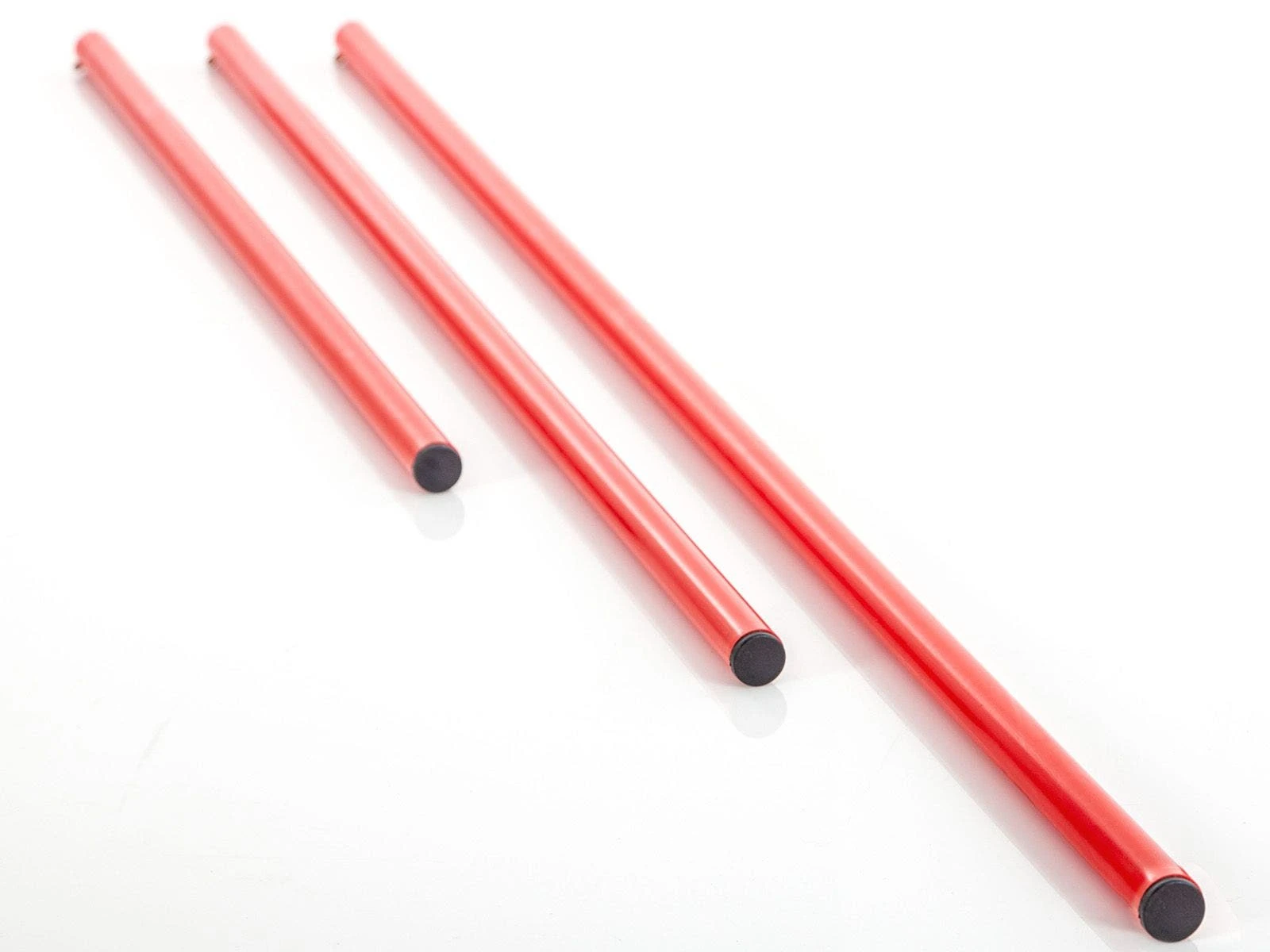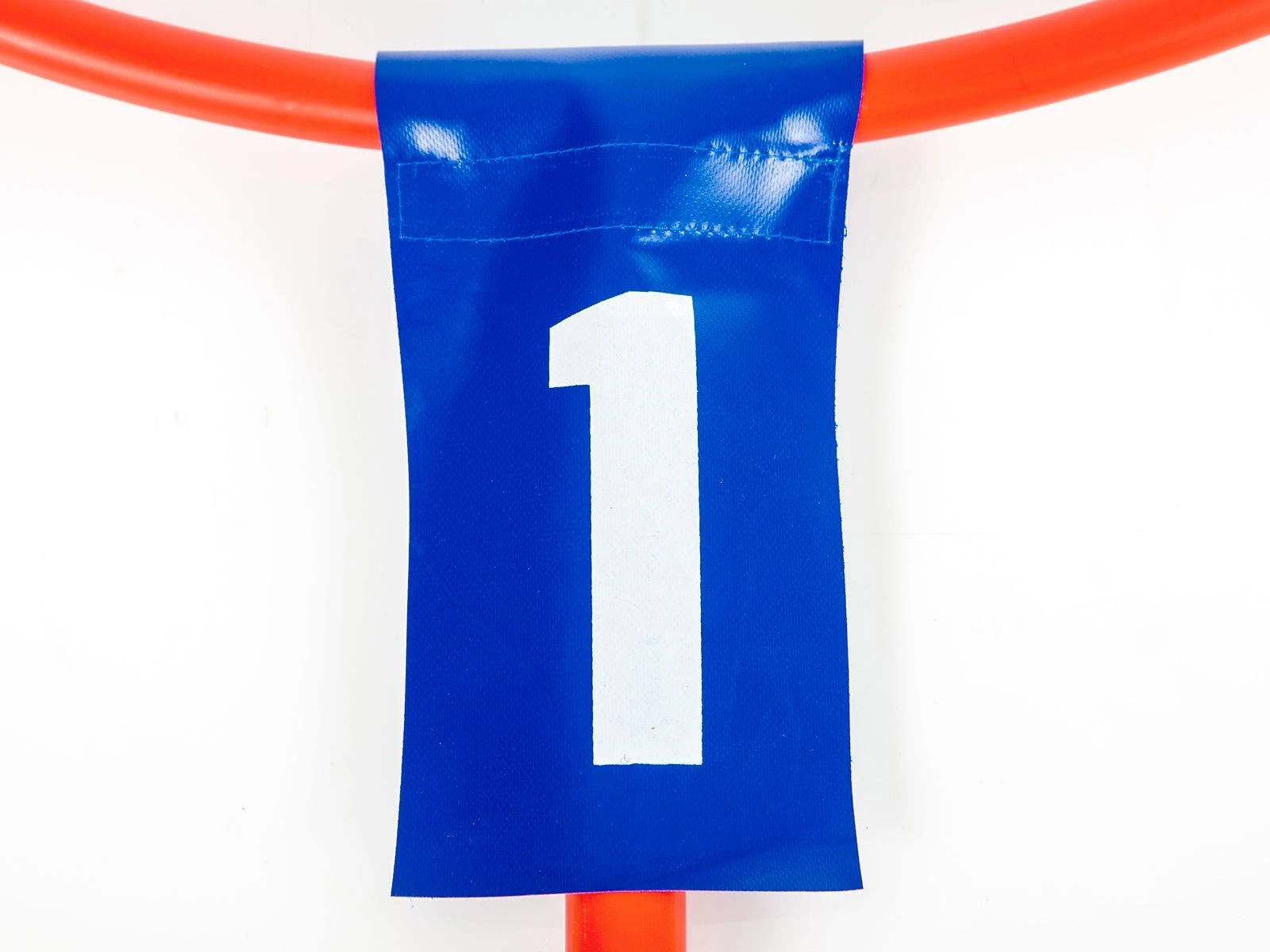 Three hoop sizes—18”, 24”, and 30” dia—as well as 3 pole heights—30”, 40”, and 50”H—make for numerous configurations that teachers can tailor to meet all skill levels. A push pin mechanism lets them swap smaller hoops for larger, or vice versa, on any height pole. Numbered flags securely attach to targets via hook-and-loop fasteners.