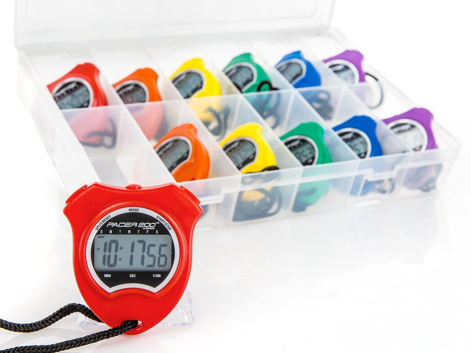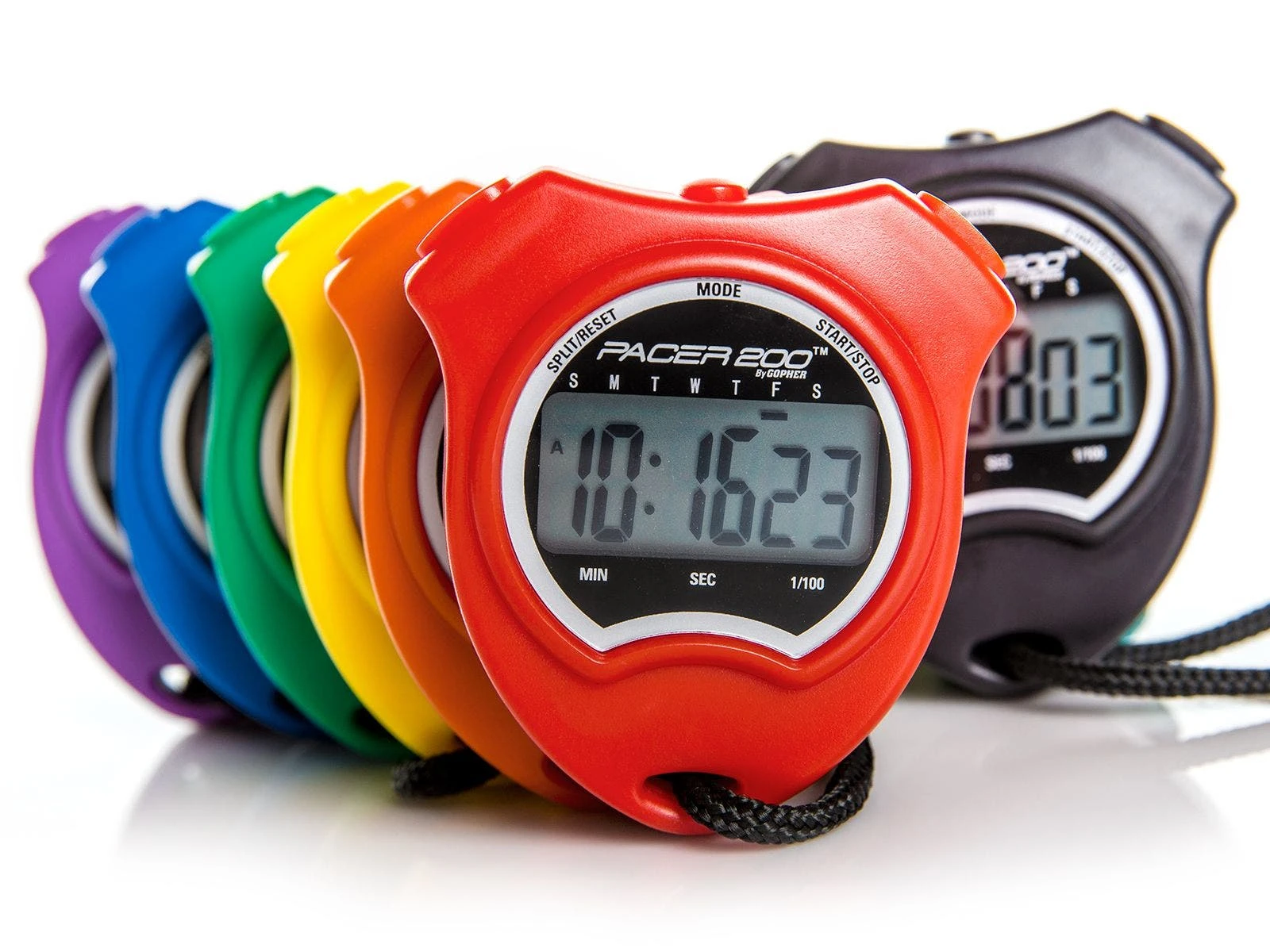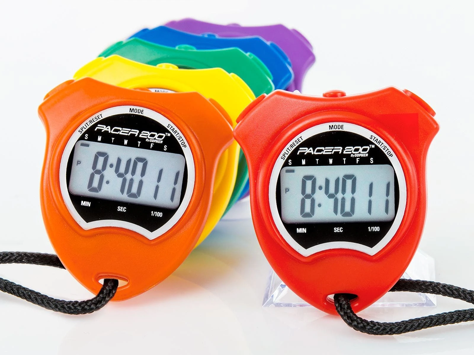 Rainbow Sets are great for PE settings; break the class into groups for faster timing of jump rope events, relay races, and more! Gopher Pacer 200 Stopwatches are available individually, in a Rainbow Set of 6, or a Pack of 12 with storage.