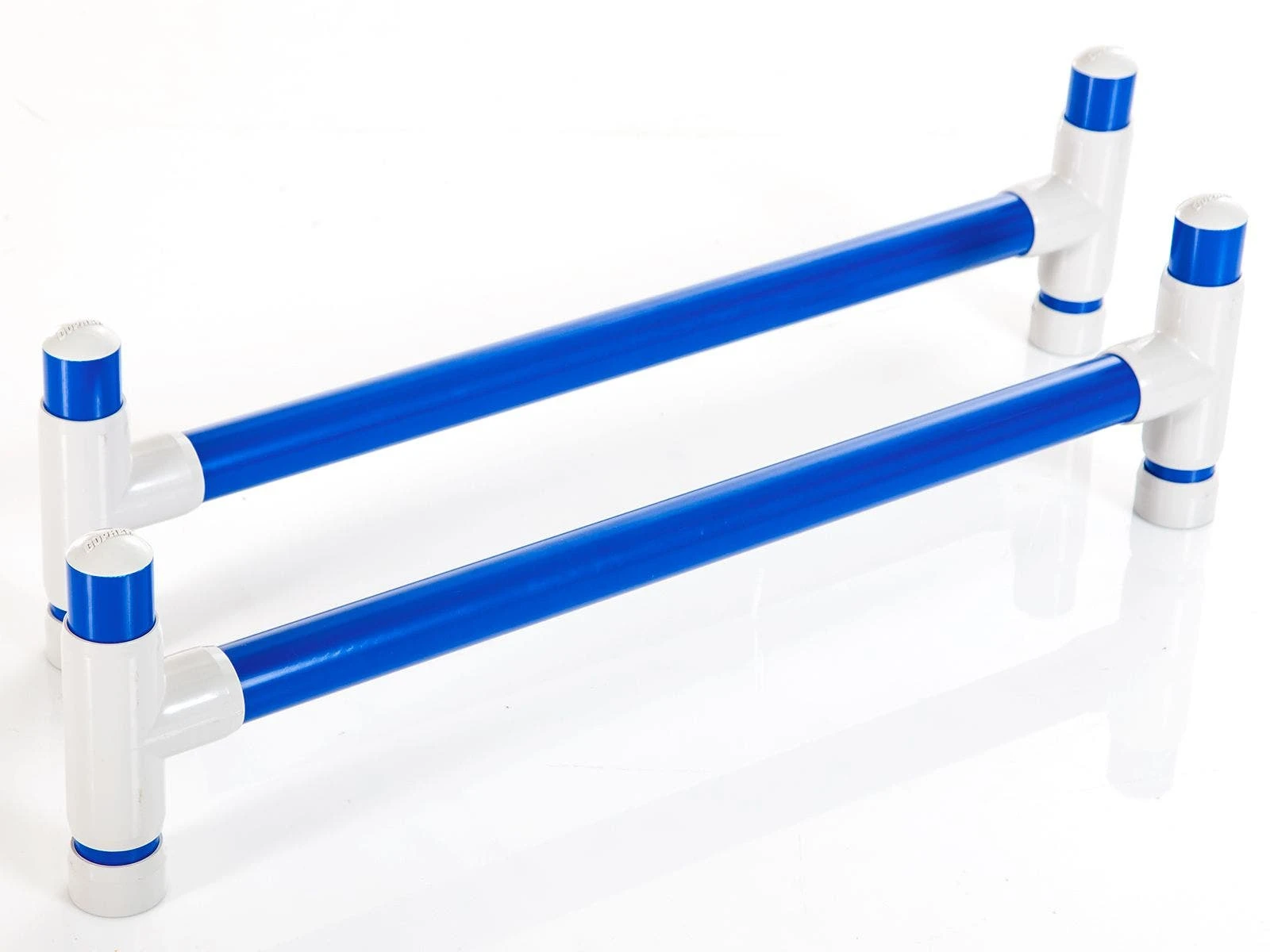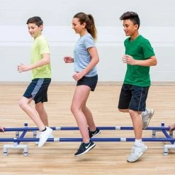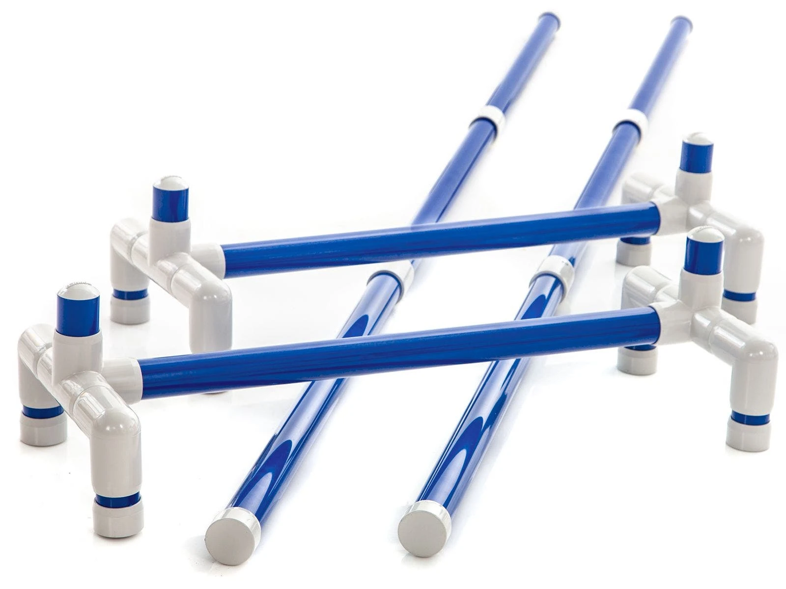 Sturdy ABS-plastic jump poles and slide boards feature soft vinyl end caps for safety and nonslip anchoring, making this set extremely durable and easy to use indoors or out. Three connecting sections prevent bowing in the poles and cross bars. Made with convenient pushpins, this set is easy to assemble and disassemble, yet remains durably intact during activities. When not in use, simply disassemble for convenient, compact storage.