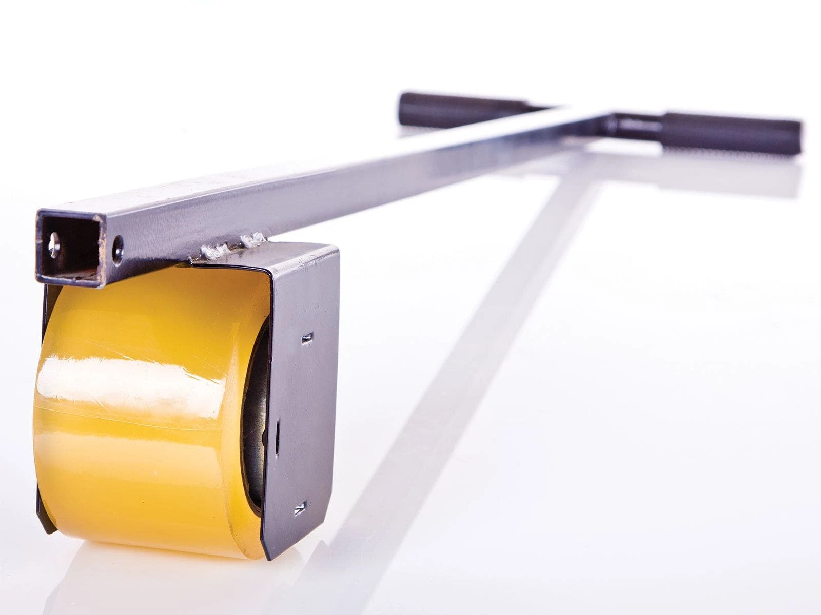 The dispenser makes tape application quick and easy. When applying the tape, simply walk behind the tape dispenser and let it do its work. The tape roll locks into place in the steel holding box so it won’t fall out as you walk along.
