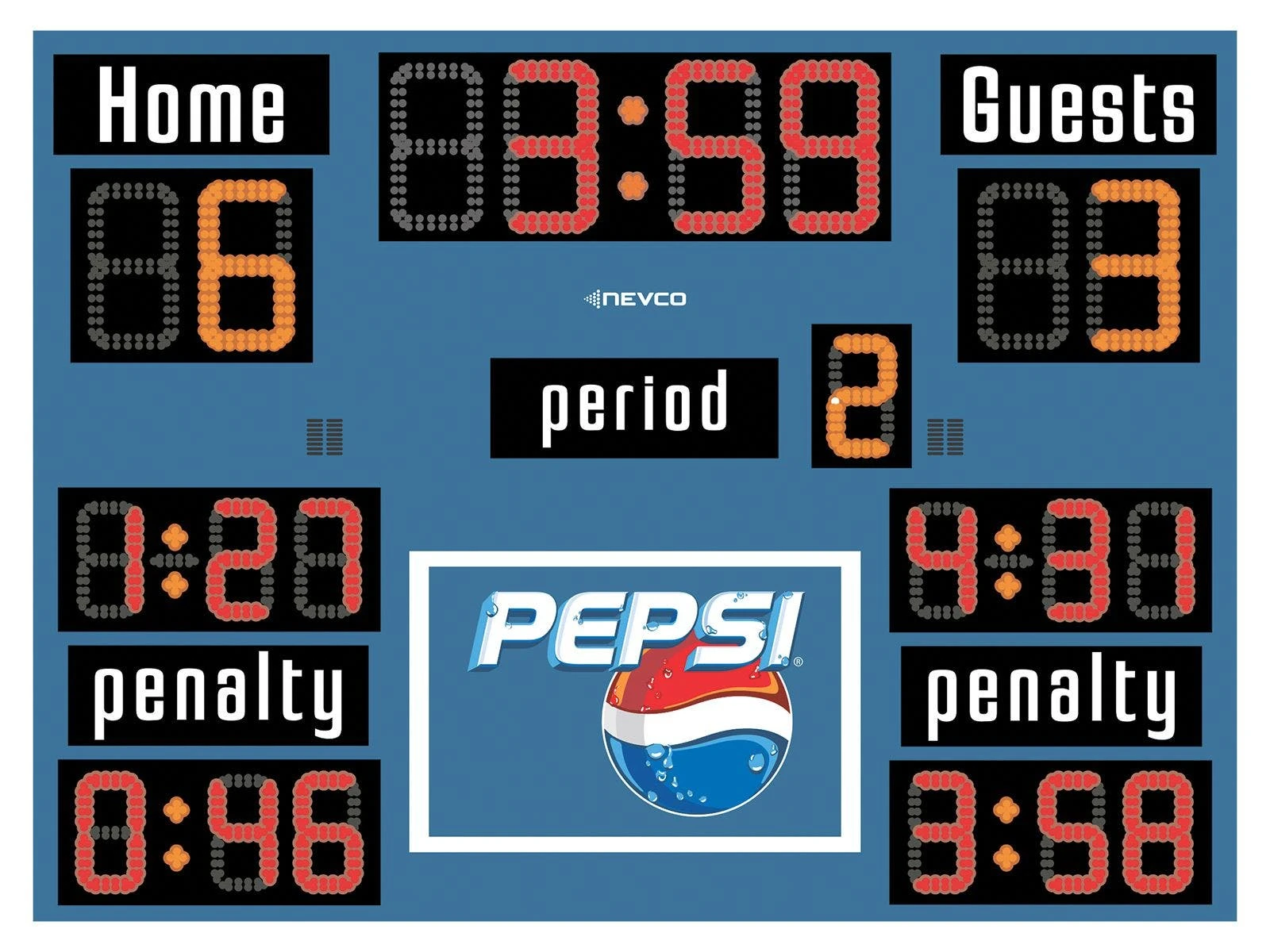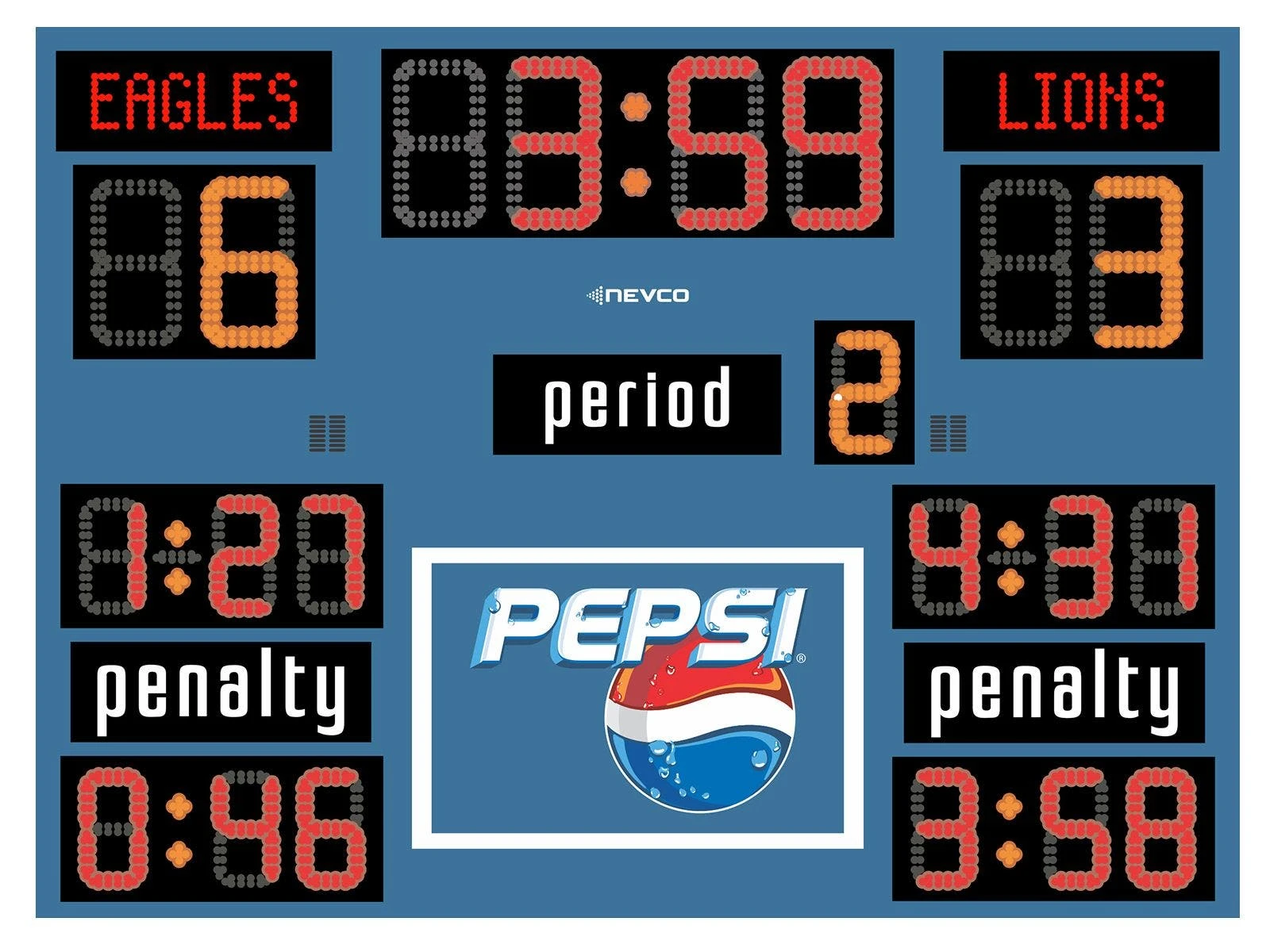 This standard hockey scoreboard indicates game time, team scores, period, and two penalty timers per team. Clearly see this information displayed via 13”H and 9”H digits. Long-lasting LED lights save energy and are bright, even during daytime.