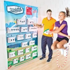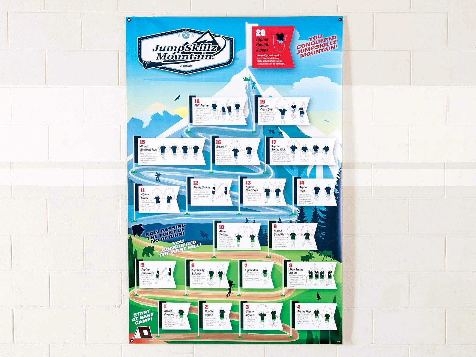 Our large, vinyl-covered 6’L x 4’W banner displays step-by-step instruction and diagrams for 20 jumping skills and helps track progress. The progression helps provide them with a fun, new challenge with each jump up the mountain and helps them keep them engaged and challenged.