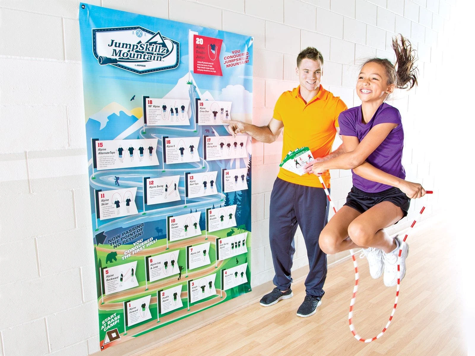 Students start at the base of the JumpSkillz Mountain and work their way up to the top by mastering 20 skills ranging from basic to advanced. Our only complete jump rope package puts a new twist on your usual rope unit by providing a fun jumping challenge with 20 exciting skills.