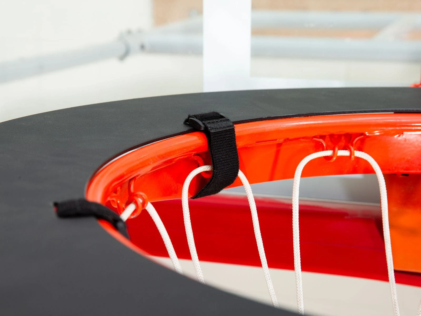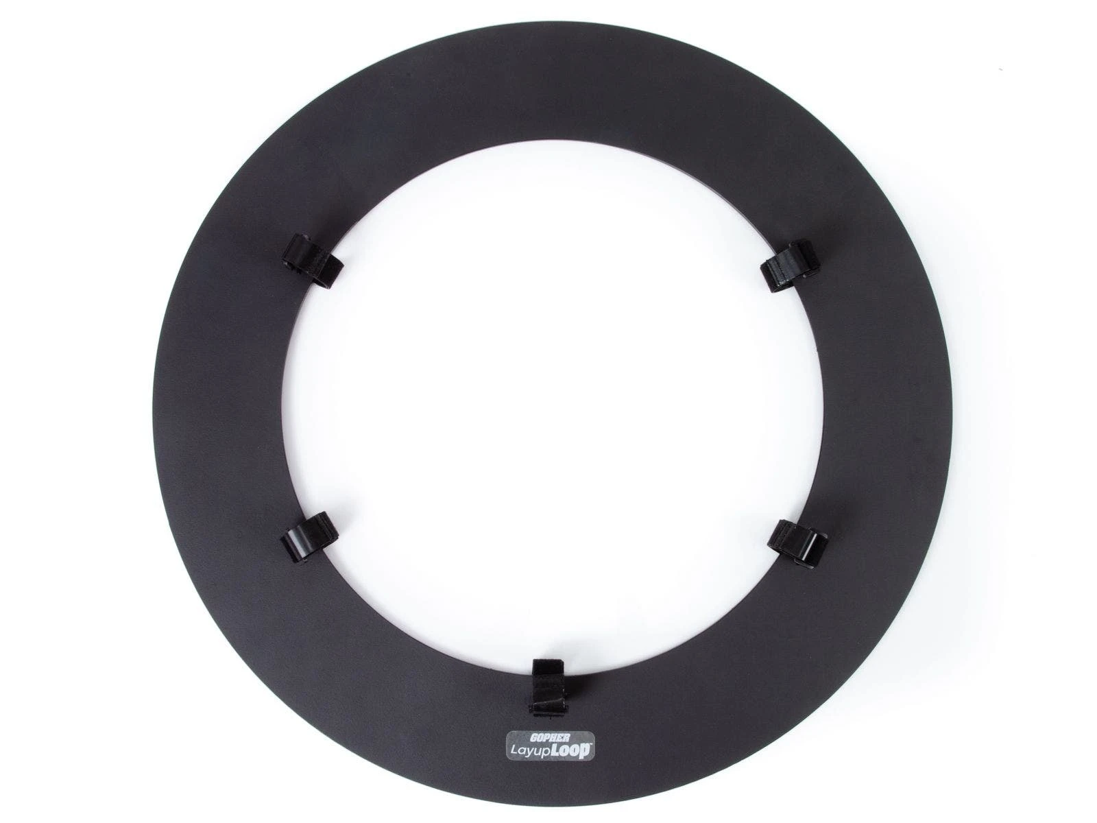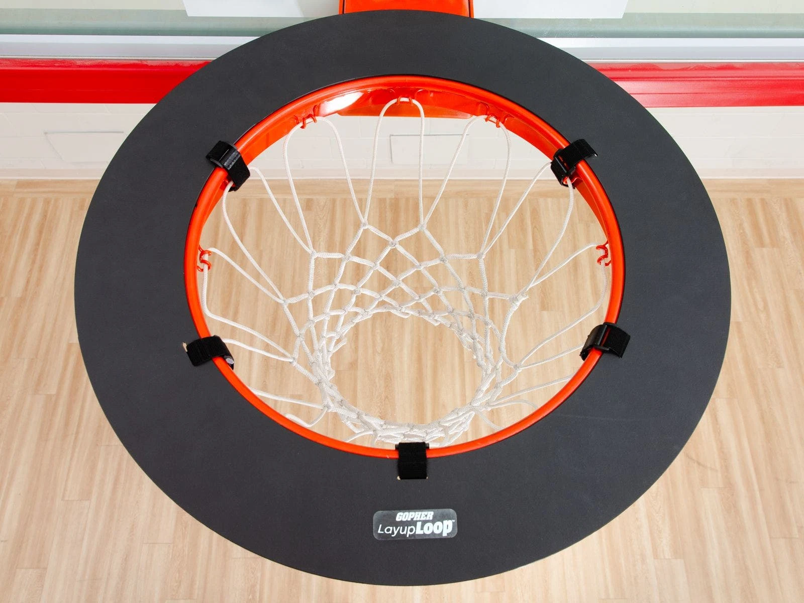 Specialized loop attaches to the basketball rim, requiring players to adjust their aim with the ball for more success. It attaches via 5 hook-and-loop fastener strips (8″L x 1″W) that wrap around the rim. Loop is made of black high-density polyethylene plastic. It has a 27-1/2″ OD with an 18-3/4″ center hole for the rim. LayupLoop is 1 lb.