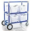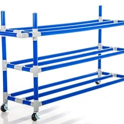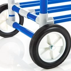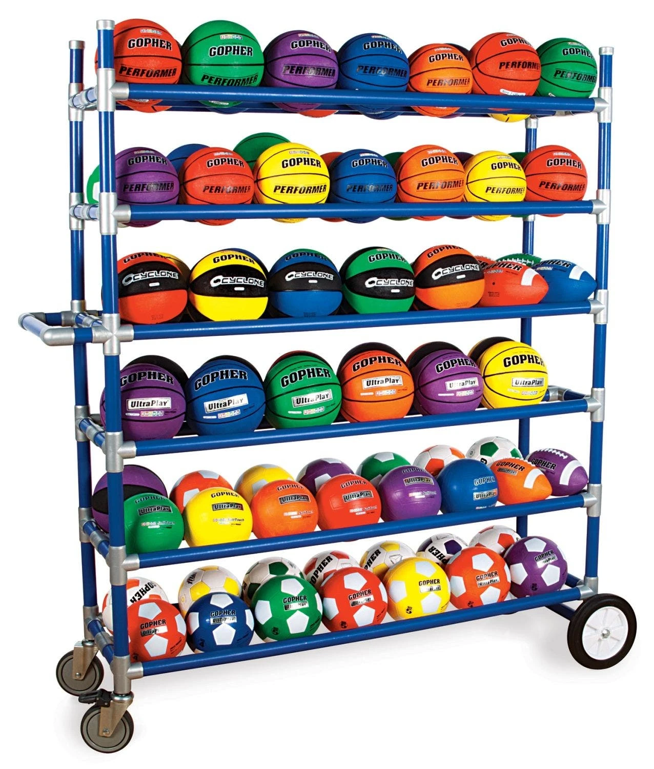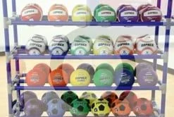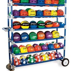 Tiered, double-wide storage racks accommodate virtually any type of activity balls, making this a standard in playground ball storage! Durable ABS plastic construction ensures it will not compromise under institutional duress, while its lightweight design and ball-bearing casters make mobility simple. Because it’s so lightweight, this rack is easily transported to indoor or outdoor play areas via a U-shaped handle. For Indoor models, four 3” dia swivel locking casters provide optimal maneuvering through doorways and around tight corners. All-Terrain models feature two 10” all-terrain wheels and two 6” swivel casters that combine ruggedness with control across any outdoor surface. Comes in 3- and 6-tier options, with indoor or outdoor wheels.