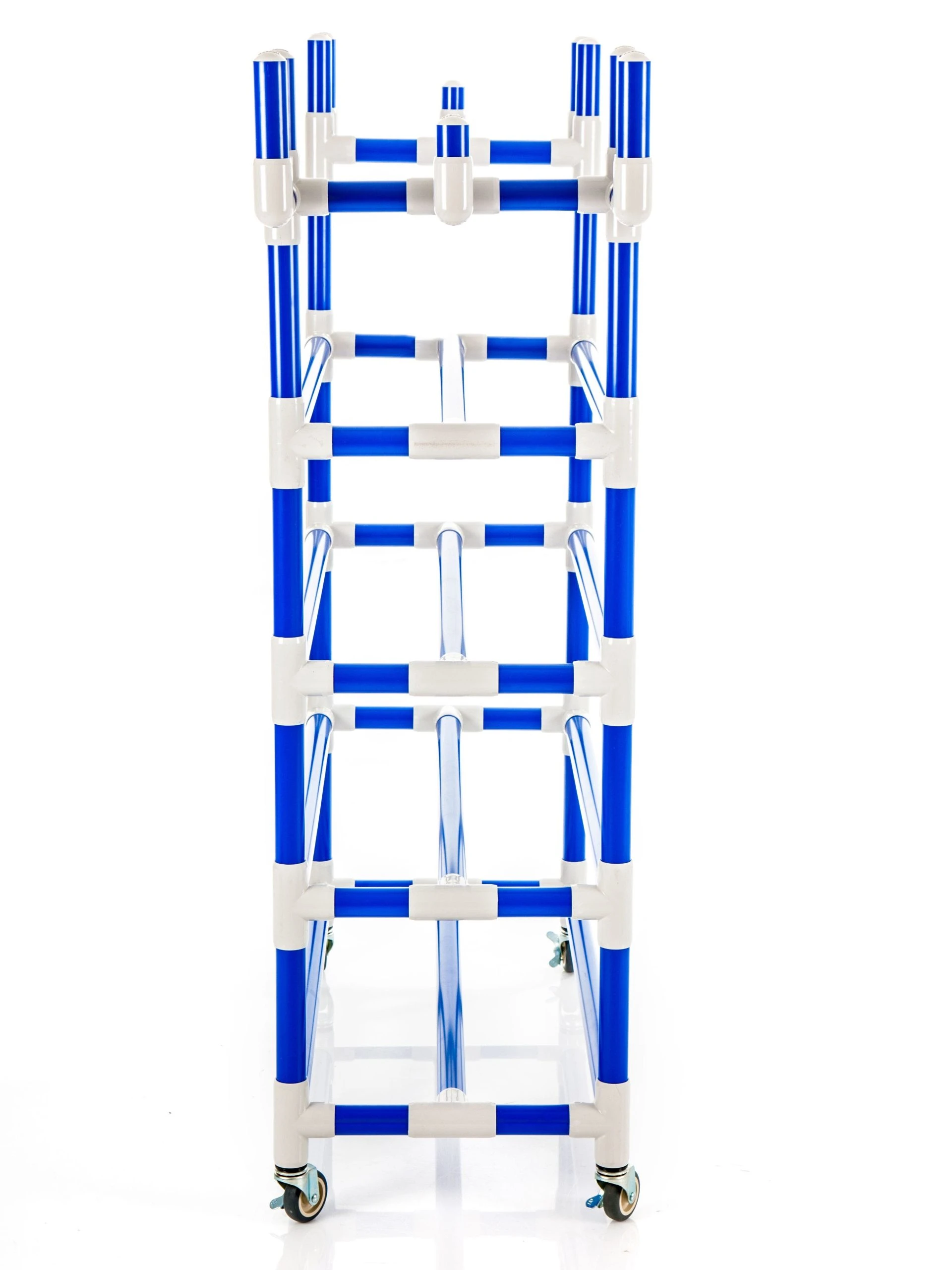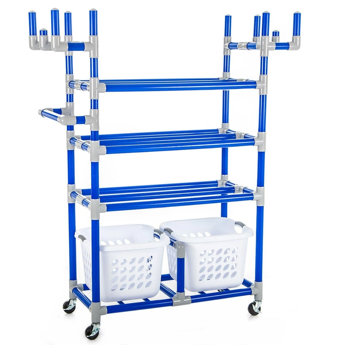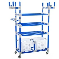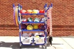 Three tiers of doubled-sided ball racks hold up to 30 balls for instant accessibility and superior organization. Below the ball racks, 2 removable 21-1/2”L x 17”W x 12”H baskets accommodate miscellaneous equipment. Three heavy duty hooks on each end (6 total) house up to 150 jump ropes and 50 hoops, preventing tangling or bending. A U-shaped handle grants additional control and a wide base design offers stability. ABS plastic stands strong against even the heaviest institutional wear and tear.