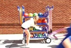 This cart accommodates up to 40 activity balls across 4 tiers of double racks, allowing for quick organization and easy identification of balls at any distance. On either side, 3 hooks (6 total) accommodate up to 150 jump ropes and 40 hoops, preventing tangling or bending.