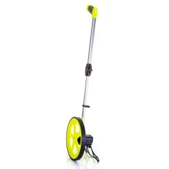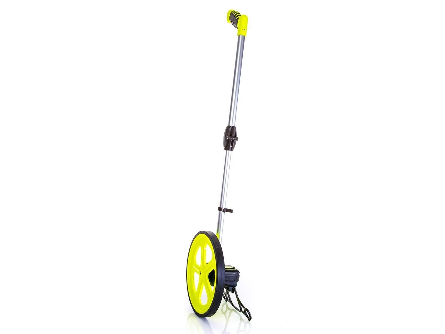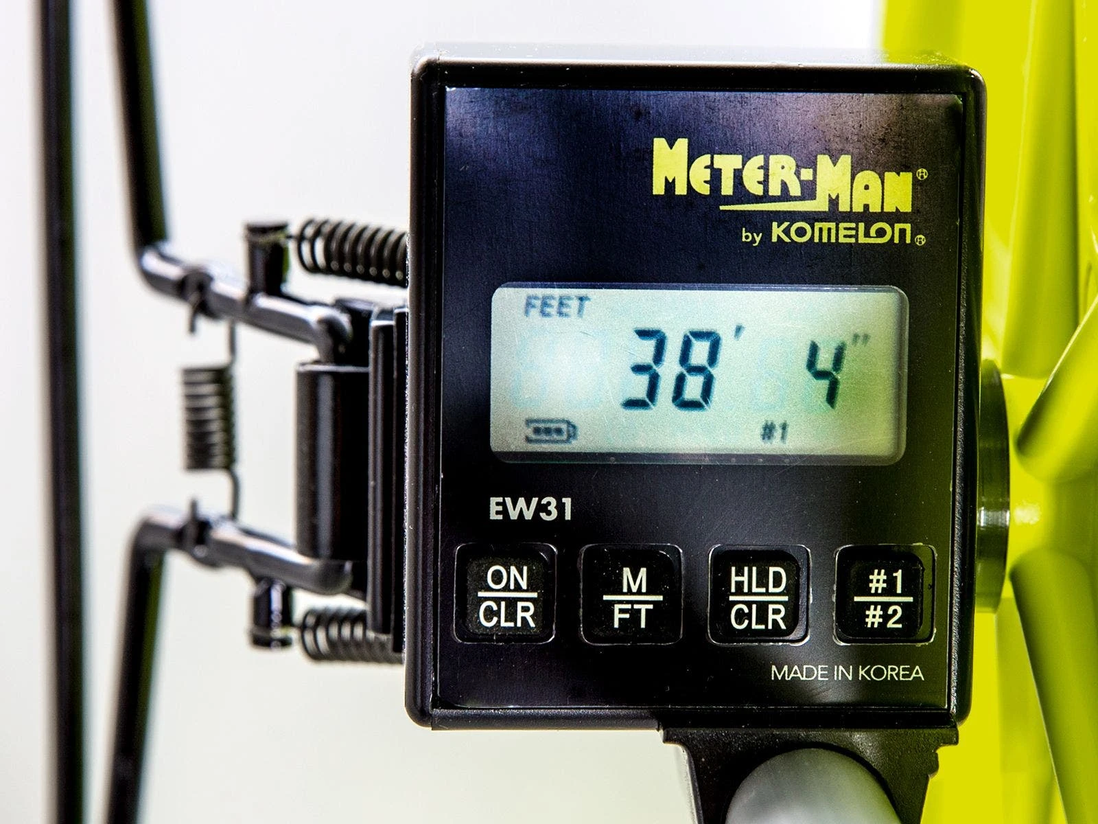 - Foot/Inch. A 5-digit counter measures in 1-inch increments. Handle extends 32” and wheels measure 10”.
