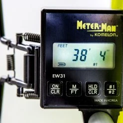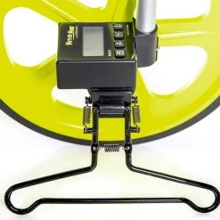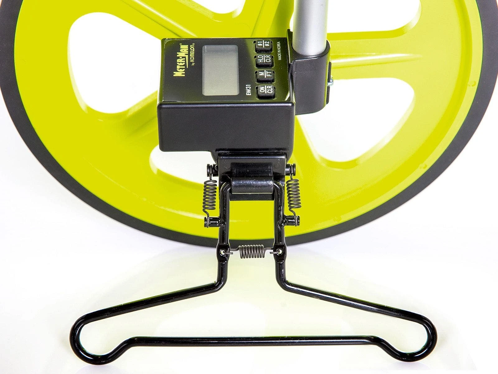 - Digital. A large digital memory display measures in feet or meters. It includes a 3V lithium battery. Handle extends 41”, and the 10” wheel measures in feet or meters.