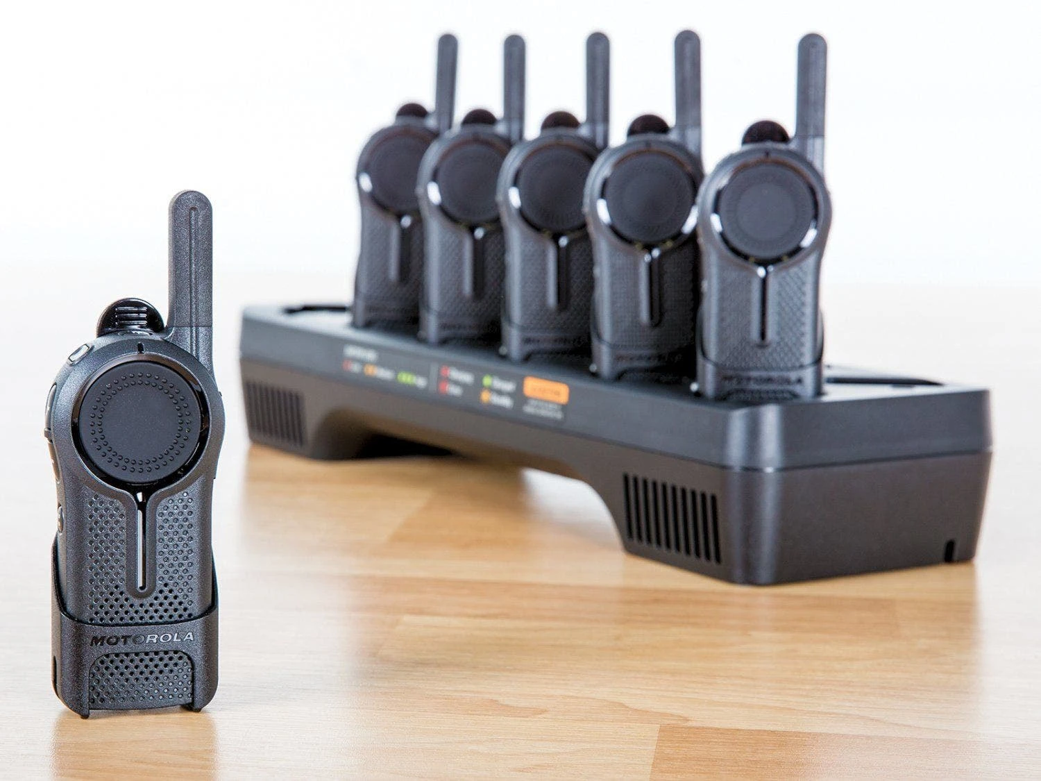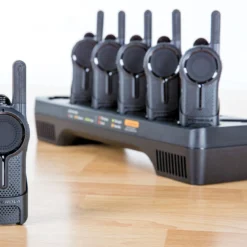 DLR radios meet Military Standards 810 C, D, E, F and G. Tough polycarbonate housing is antimicrobial to prevent the growth of bacteria and mold on radio surfaces. Measuring 4.2″H x 1.7″W x 1″D and weighing just 4.2 oz, these radios are comfortable to hold or can be easily clipped to a belt. Radios include a rechargeable lithium ion battery with up to 14 hours of talk time. Pack of 6 also includes a 12-unit, 3-1/2 hour charging dock.
