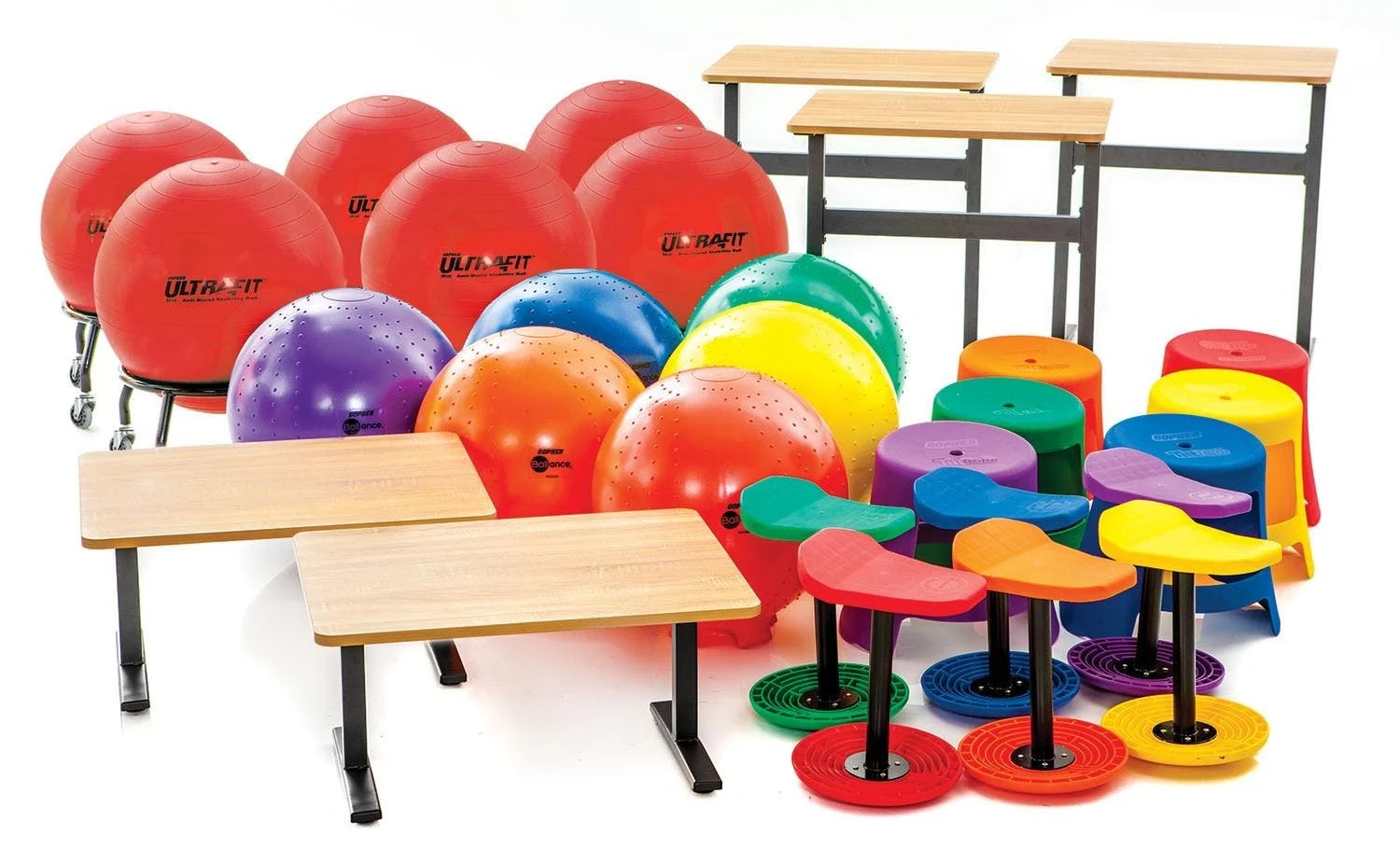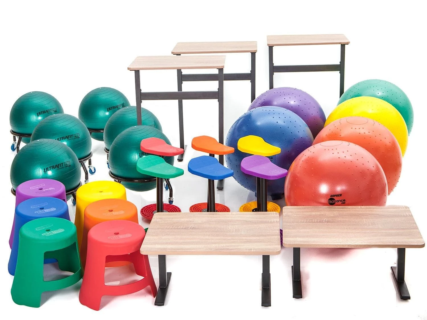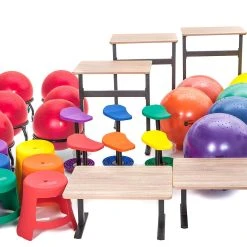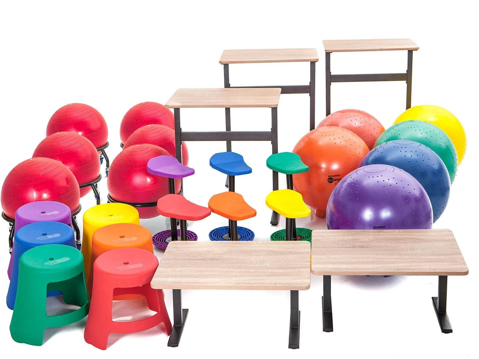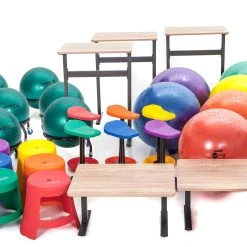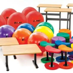 Packs include 6 Rainbow BALLance Stability Chairs, 6 TiltED Seats, 6 Revolve Stools, 6 Mo-Ball Stability Ball Chairs, 2 SmartStudy Tabletop Desks, and 3 SmartStudy Standing Desks. Choose Elementary, Middle School/Jr High, or High School for appropriate sizing. More details on pack contents below.