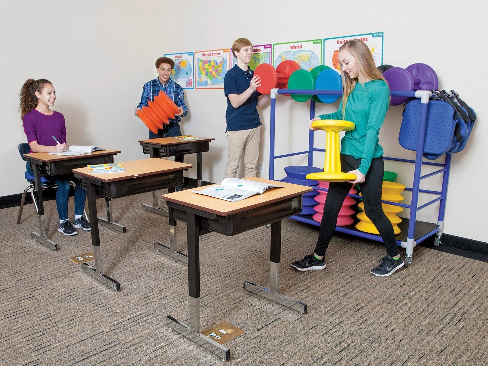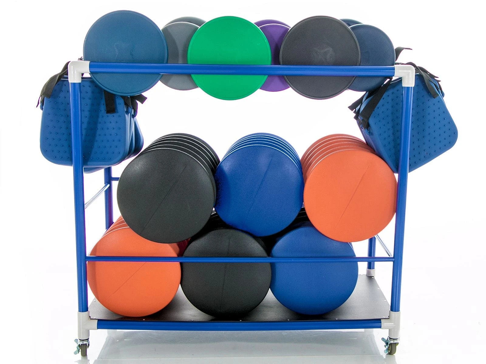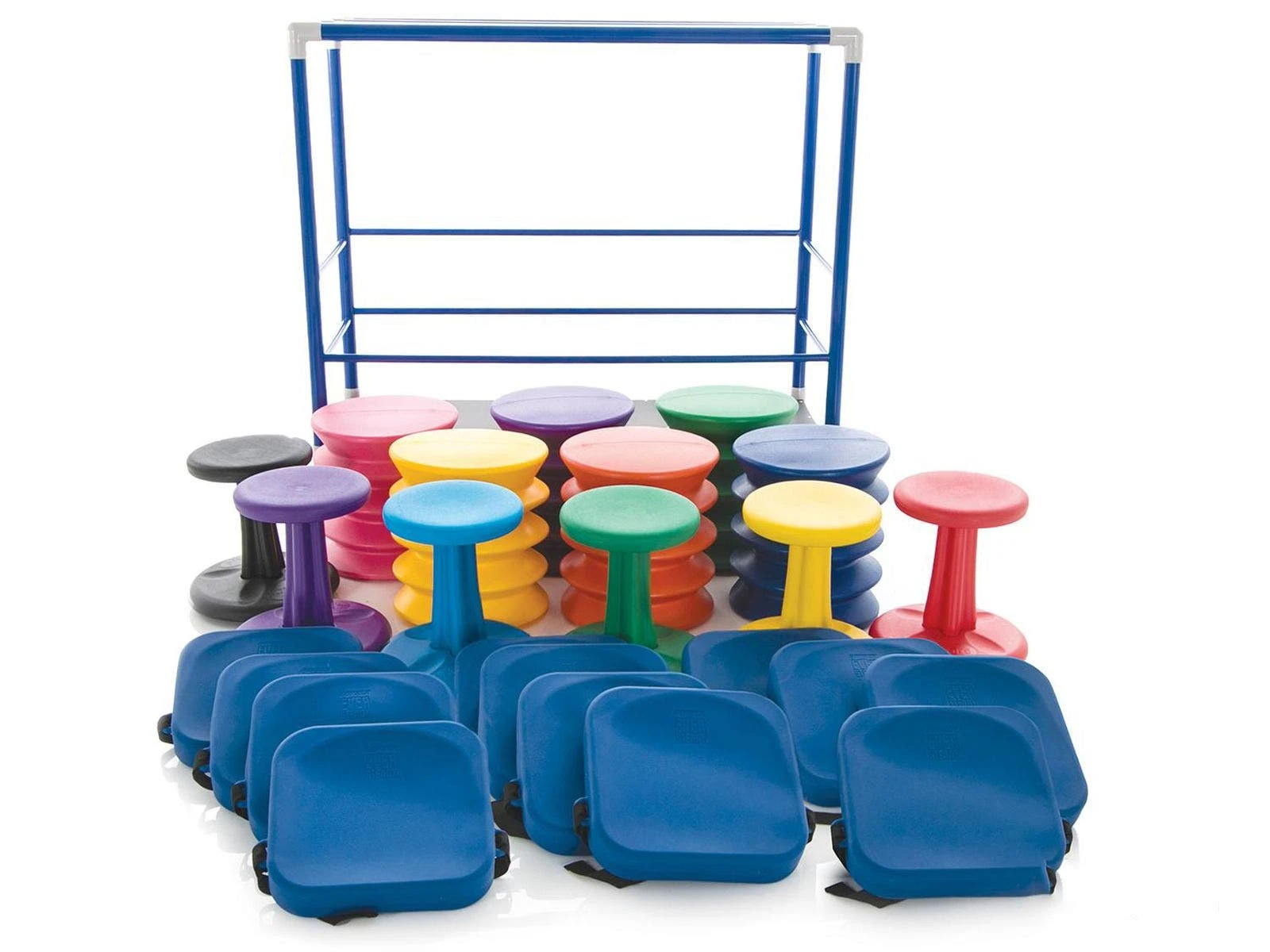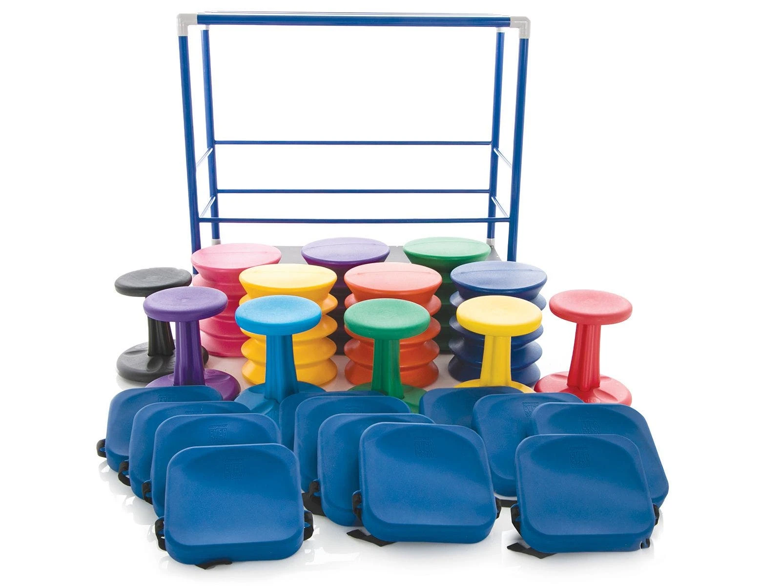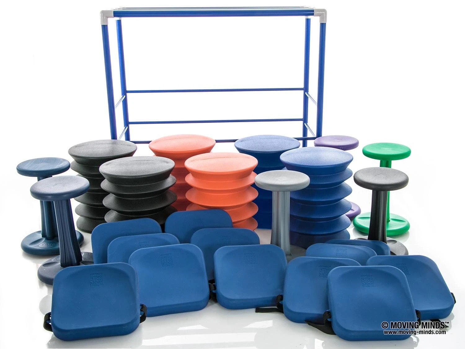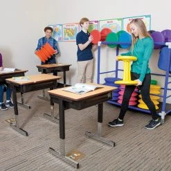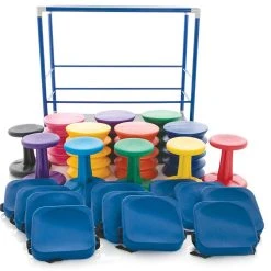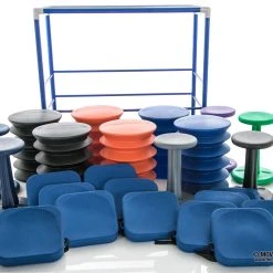 Securely store and transport all 24 seats aboard the extra-tough ABS-plastic cart, allowing teachers to create an active classroom where they need it. When a lesson concludes, simply stack the seats on the cart for convenient storage or roll it to another classroom. Includes 6 Kore WOBBLE Chairs, 6 ergoErgo Seats, 12 EverSteady Activity Cushions, and a cart to hold it all. Choose Elementary or Jr High/High School. Packs vary in equipment sizes only. Cart measures 54″L x 25-1/2″W x 50″H.