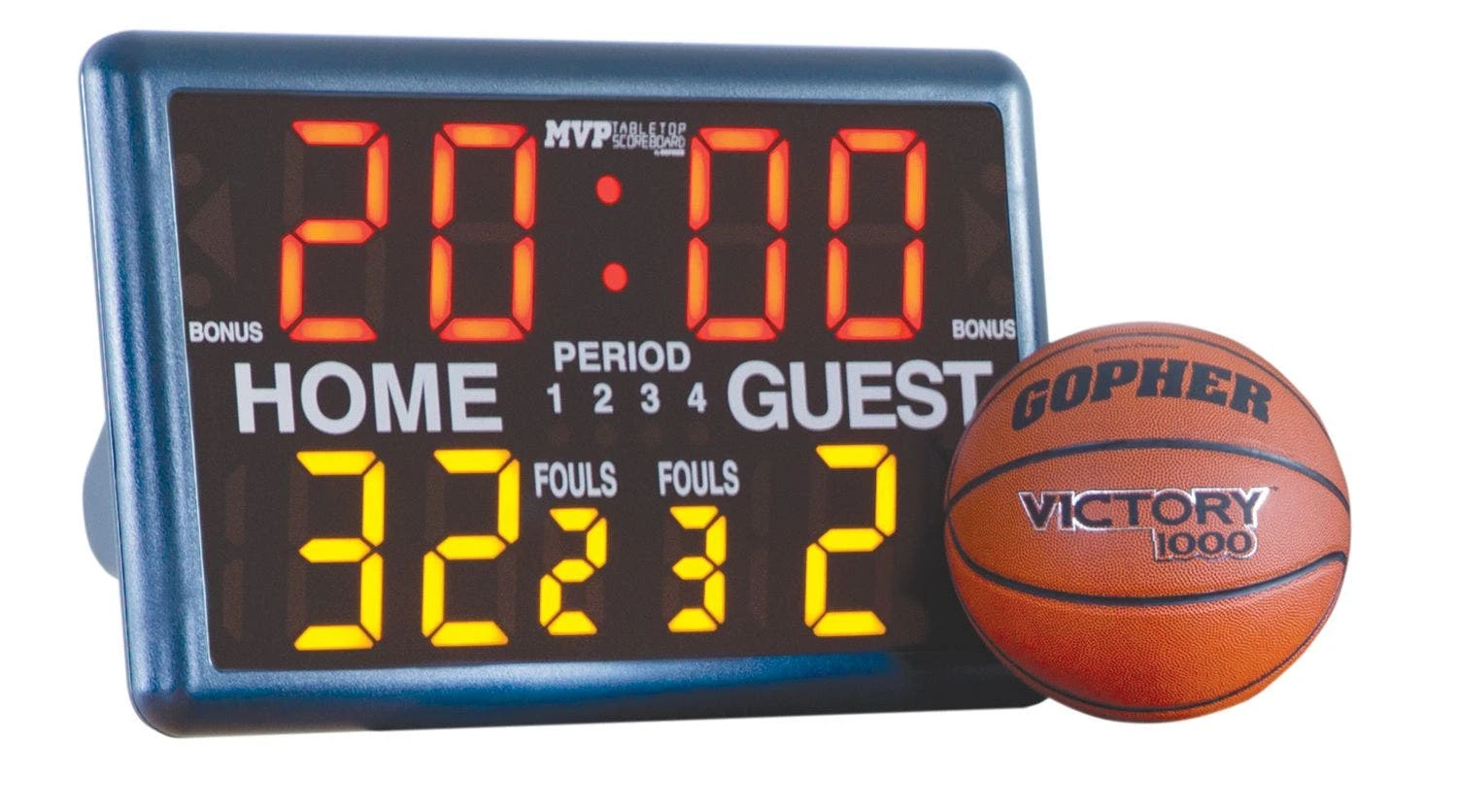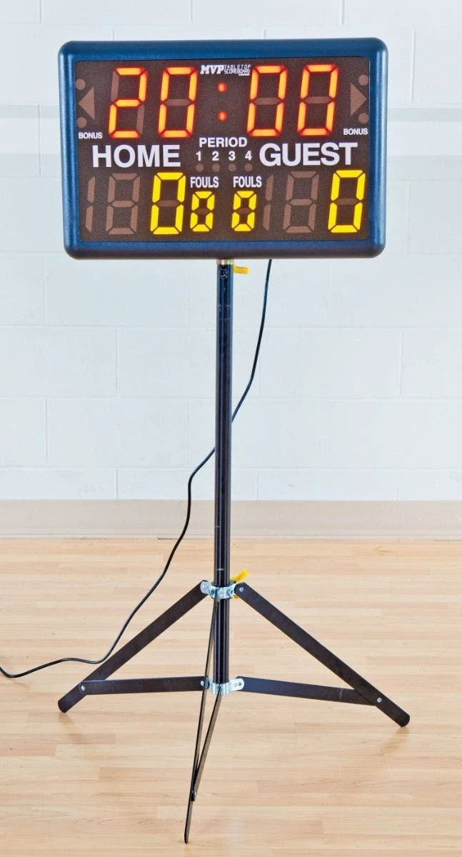 A back control panel makes it easy to set up and program the scoreboard for use during games. Modify time, bonus, possession, period, fouls, and more with easy controls. Control it during the action using the panel or the included key-fob remote. Use the built-in handle for easy transportation. The numbers on the scoreboard are easy to see from up to 150′ away. Use a floor stand (sold separately) to raise the scoreboard for easy visibility anywhere. Floor stand is 24”L x 22”W x 43”H; 13 lb.