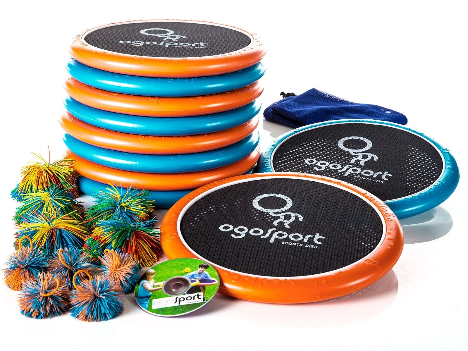 Pack includes 10 full-size discs, 10 rubber band balls, and a VersaBag mesh storage bag. Pairs include 2 discs and 1 ball.