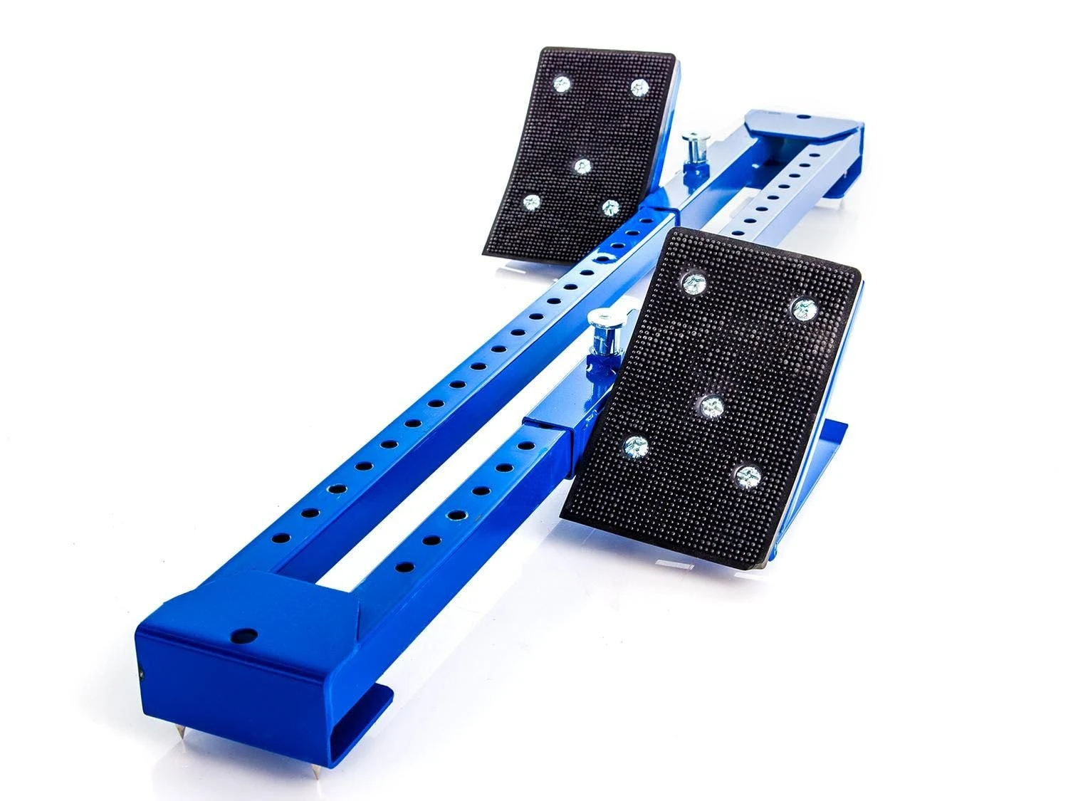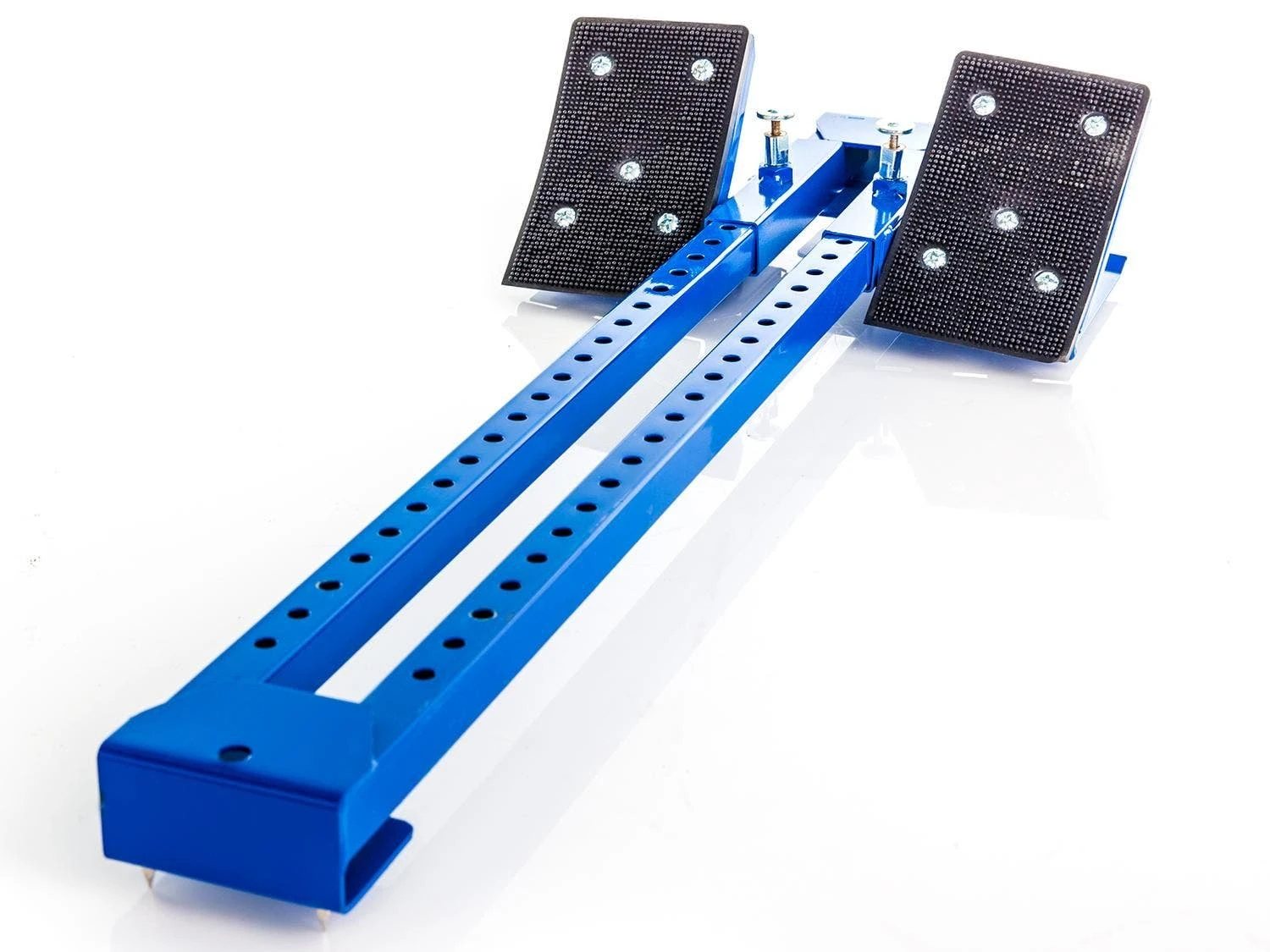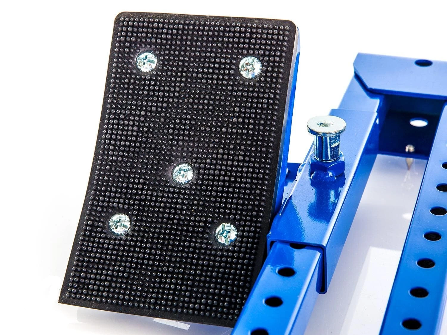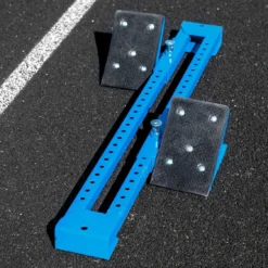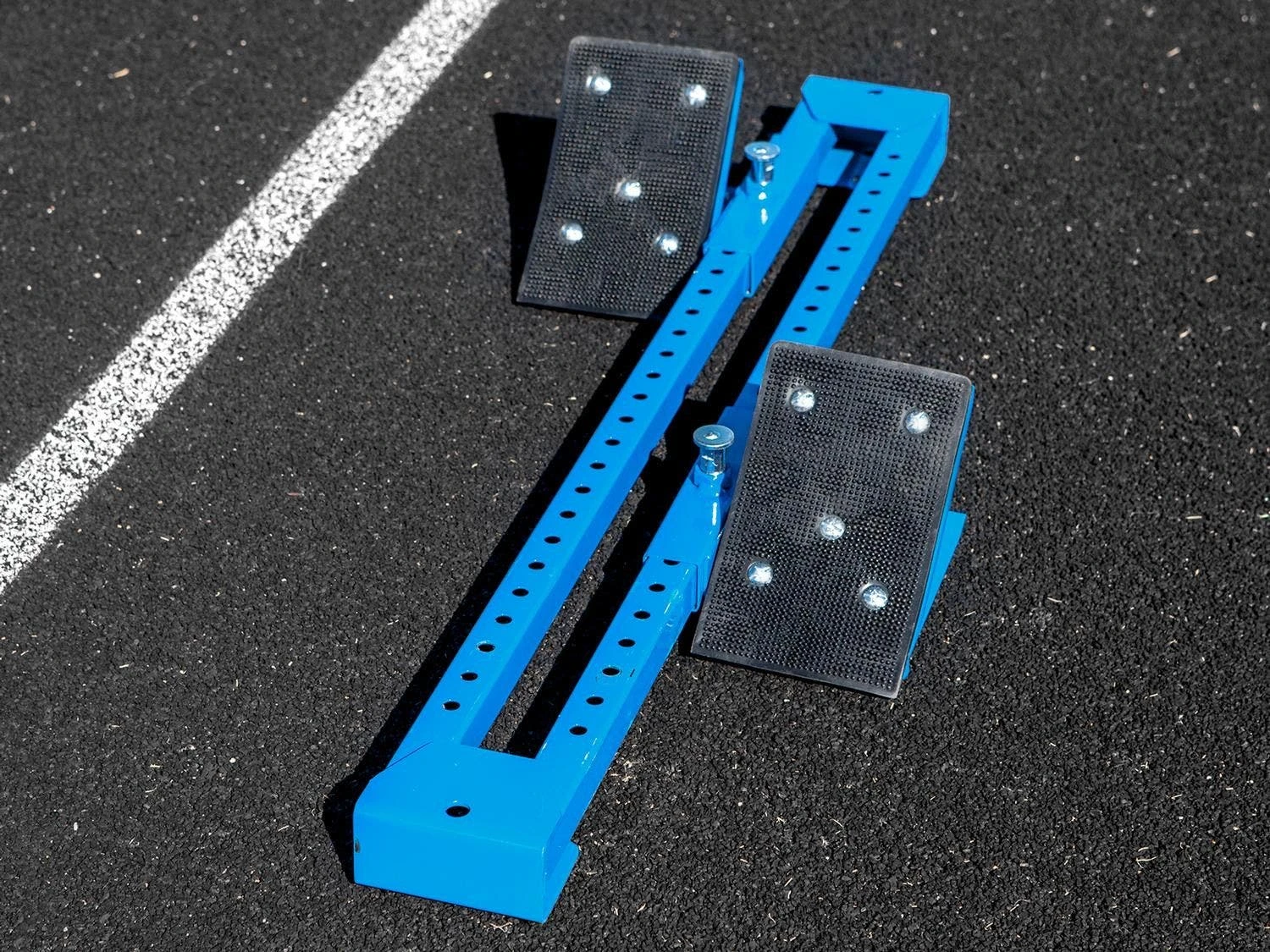 This starting block has 2 options for adjustments, and is the only one to do this! The 4″W pedals slide up and down the rail, plus the pedal angle easily adjusts to fit each runner’s size and preference. Its snap-lock plunger will quickly lock the pedals into position, so runners can instantly prepare for take-off. The starting block features all-weather and anchor spikes for additional traction, plus an adjustment wrench. 28″L; 12 lb.