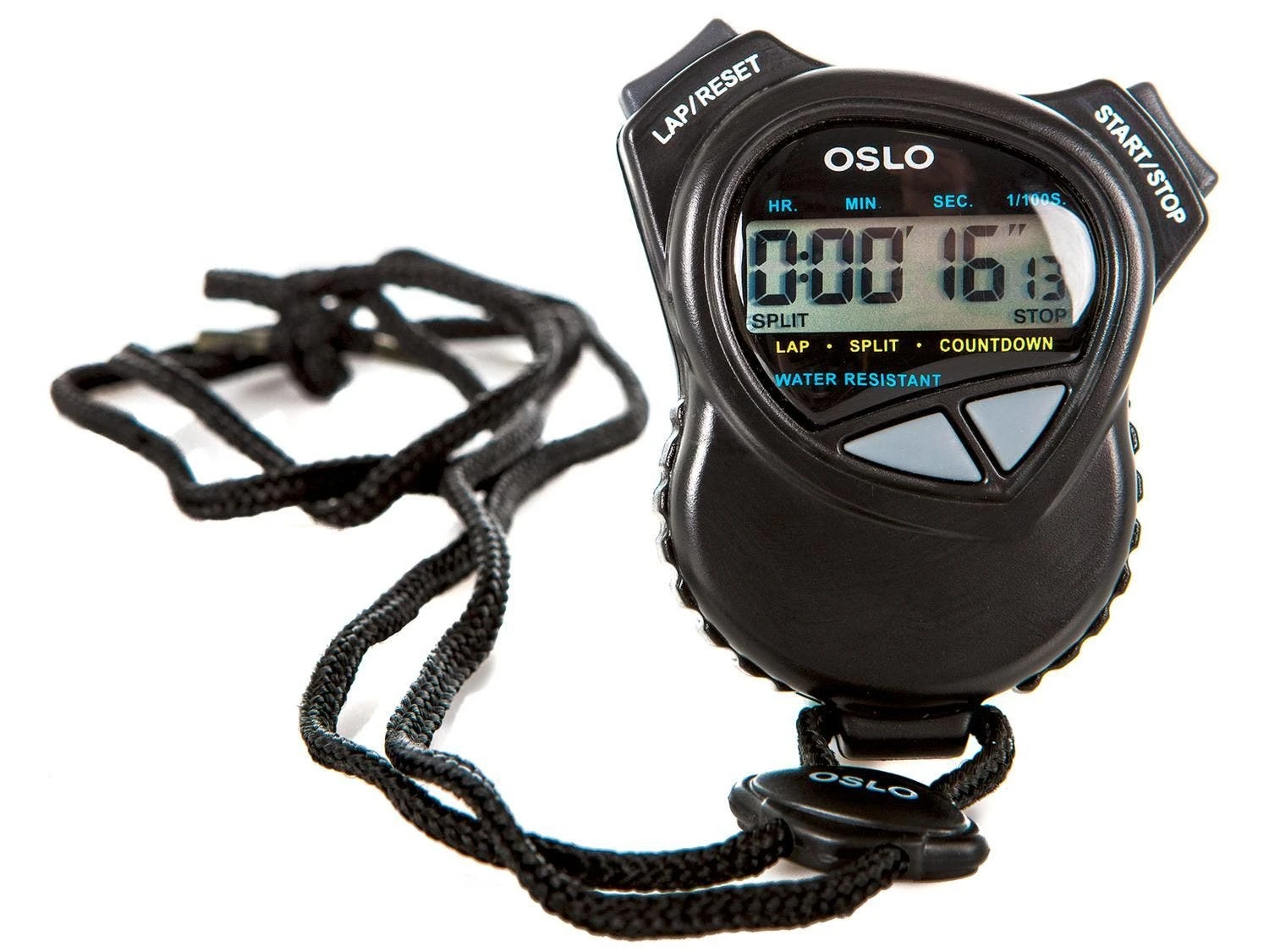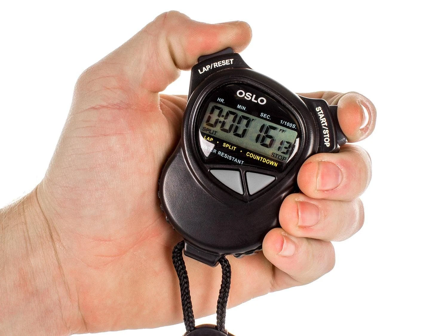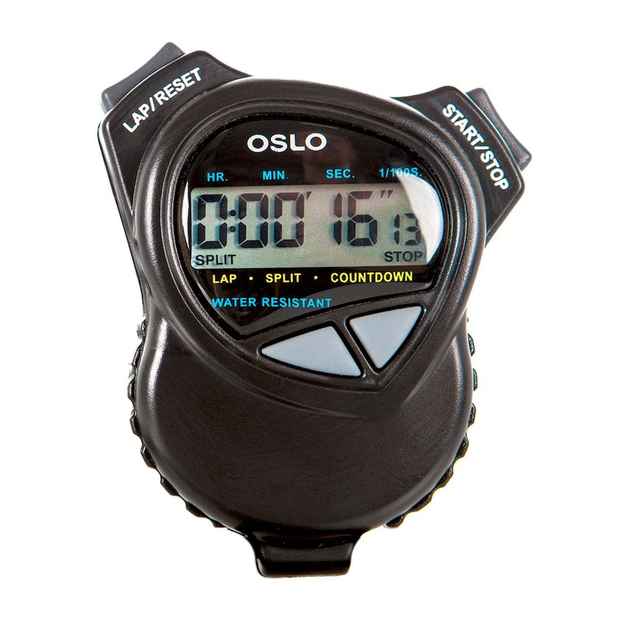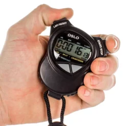 Recall unlimited time readings with Two Finish Time memory recall function on this stopwatch’s extra-large display. Split, lap, and single event timing modes make this a comprehensive stopwatch at an excellent value. Accuracy to 1/100 second up to 10 hours means you’ll have reliable data after every race or event. In addition, this stopwatch shows time remaining and counts up or down (countdown range is 10 hours with 1/100 second precision), and sounds an alarm when time is up. Quality construction includes soft rubberized push-buttons and side grips for effortless operation. 4″L x 3″W x 1″H; 4 oz.