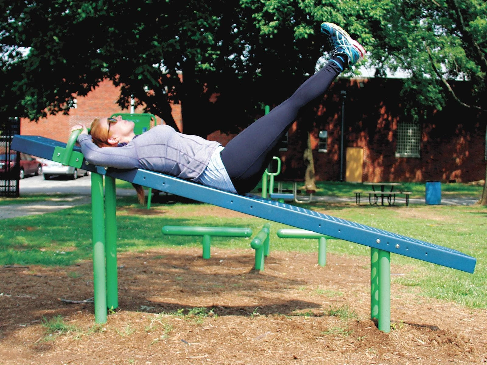 Start by laying on your back and grab the bar above your head with both hands. Lift your heels off the platform and curl the legs up to engage the core. Station includes a sign with steps on how to use the equipment, a muscle diagram displaying the muscles that will be worked with the equipment, and a QR code to access video tutorials of various exercises.