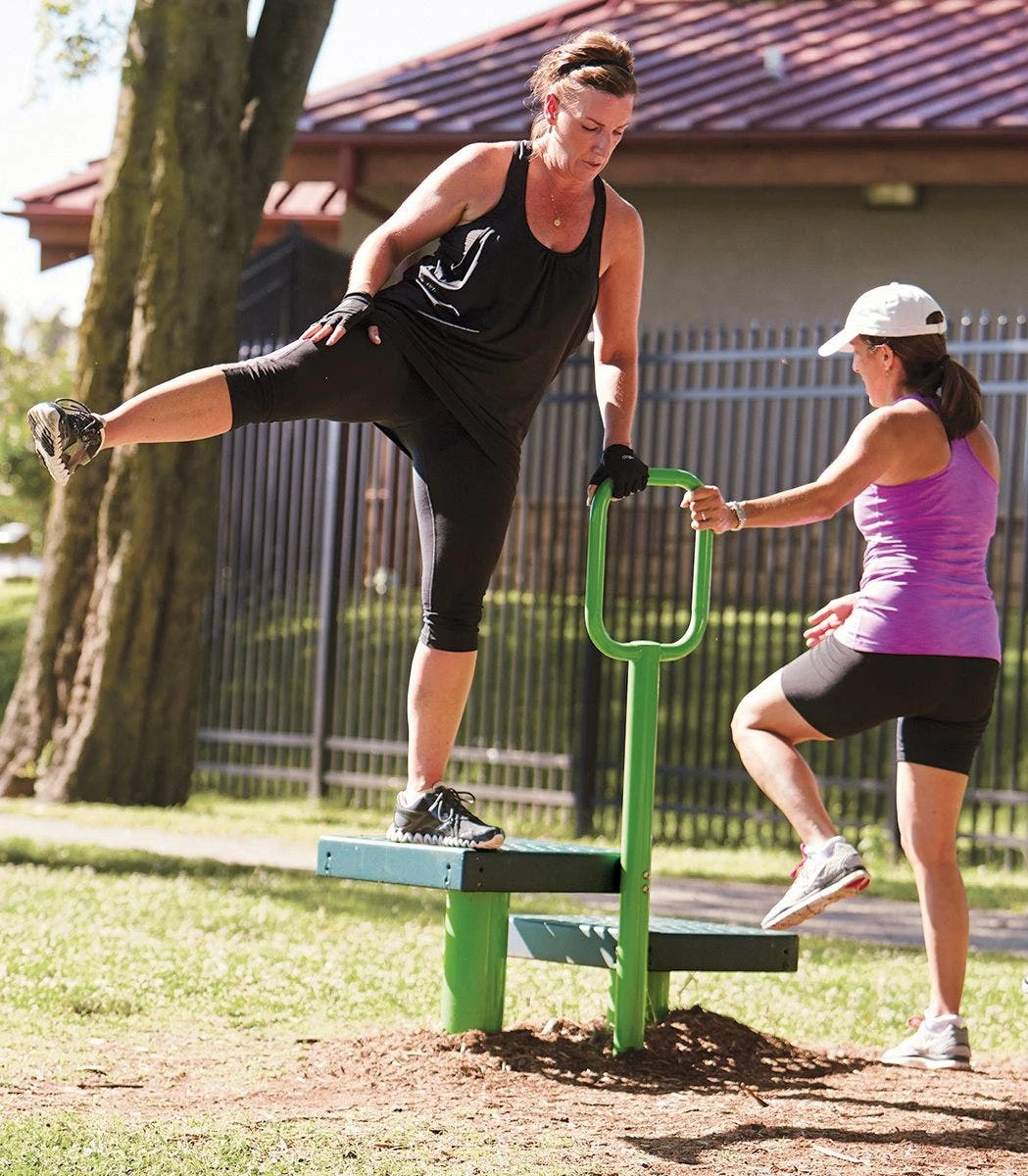 Stepping up and down from the equipment’s platforms serves as an engaging activity that increases the user’s heart rate. Station includes a sign with steps on how to use the equipment, a muscle diagram displaying the muscles that will be worked with the equipment, and a QR code to access video tutorials of various exercises.