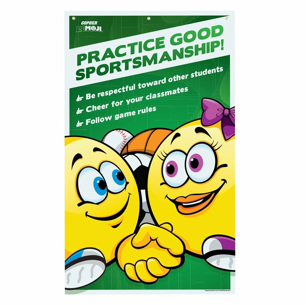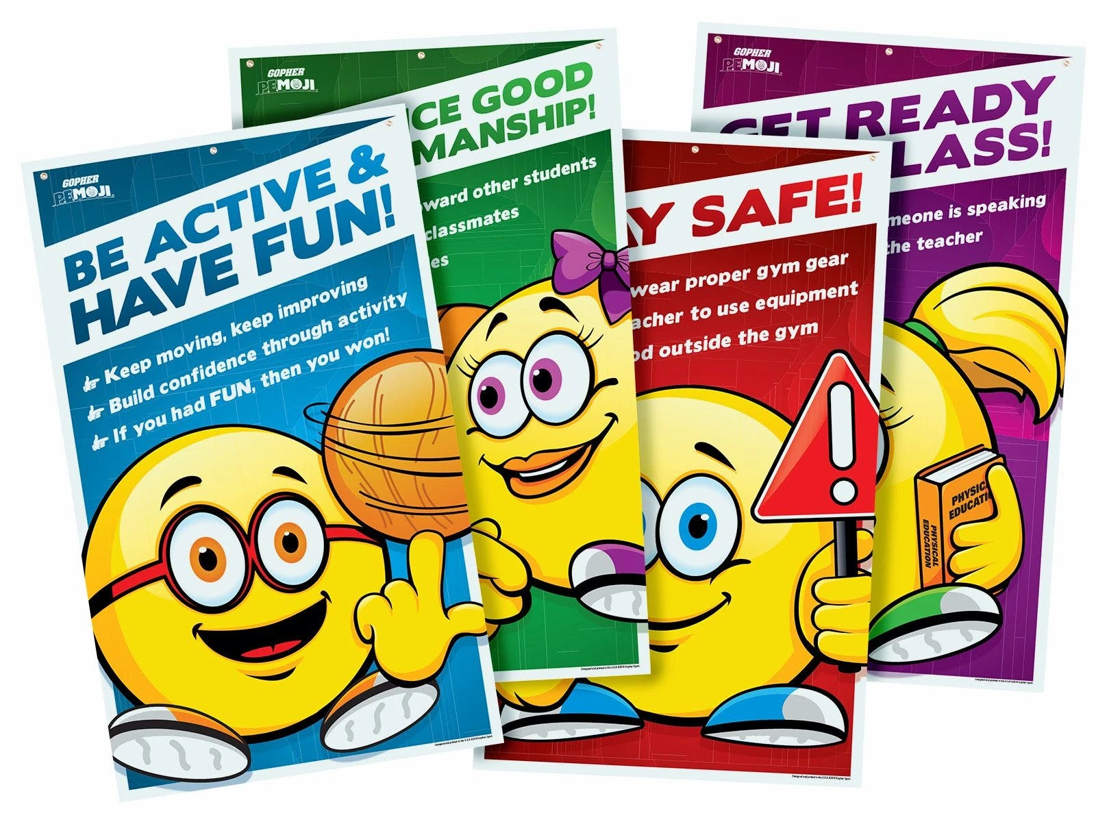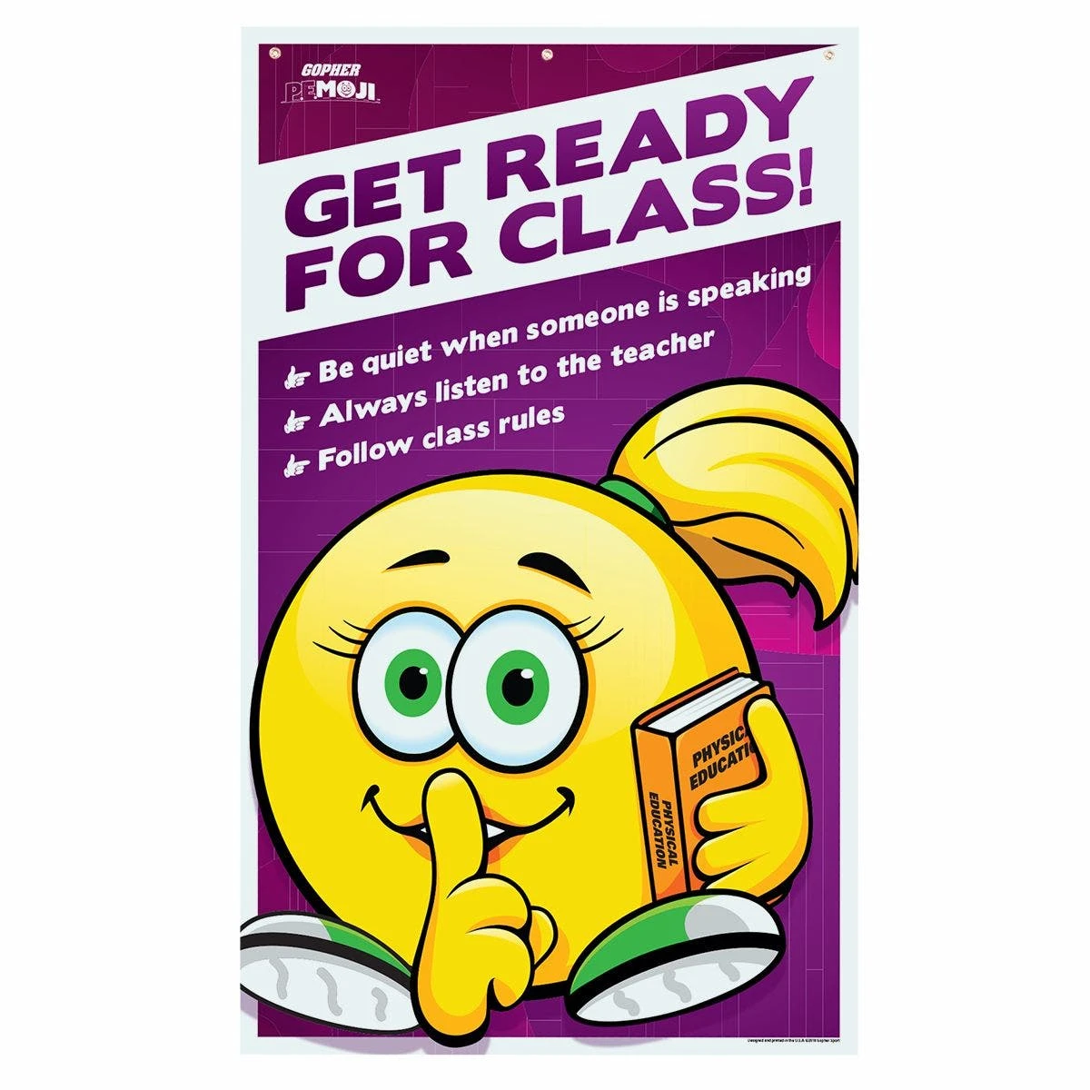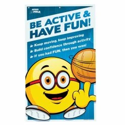 These classroom banners feature expressive emojis that remind students of the rules and guidelines in the gym. Four colorful and eye-catching banners help students focus to get ready for class, stay safe, practice good sportsmanship, and be active and have fun. Students easily relate to fun emoji faces. Heavy-duty vinyl construction lasts for years and three metal grommets across the top allow for secure hanging. 36”W x 60”L.