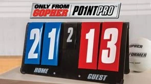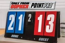 Versatile scoreboard is ideal for tracking points during basketball, volleyball, and other indoor games. Coated wooden case folds inside out and stands upright, displaying 7″H white numbers printed on tough vinyl. Folds for secure storage and has a convenient nylon carrying handle. PointPro scores from 0-99, while PointPro Plus scores from 0-999.